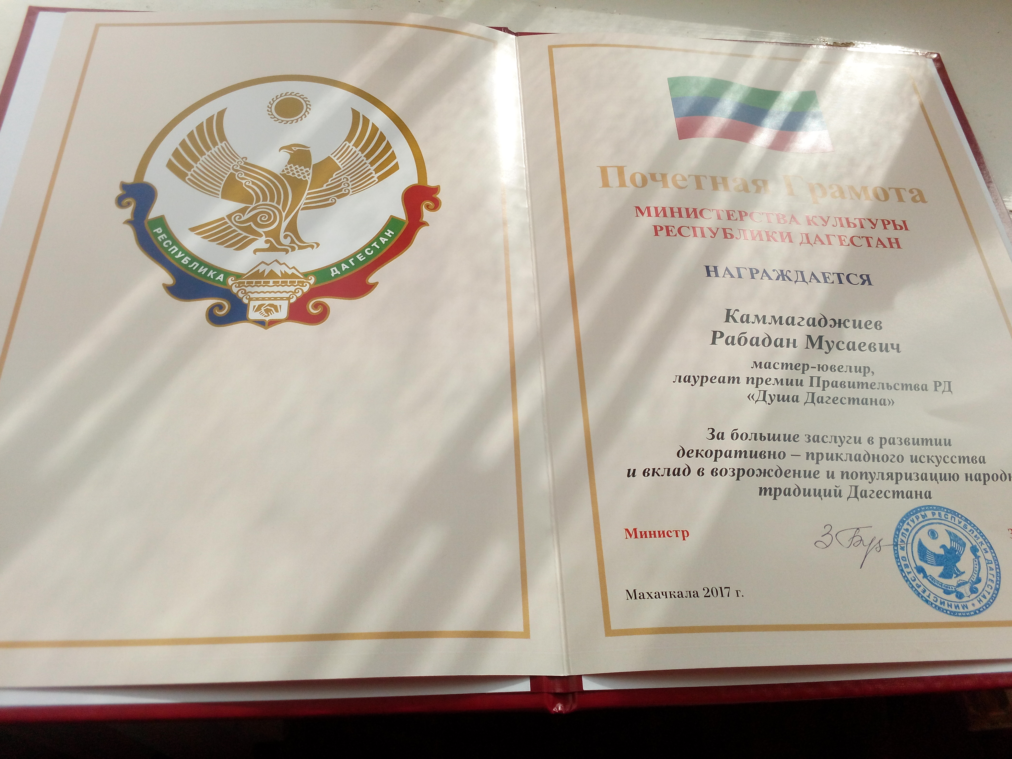 В июле 2018года занял первое место во всероссийском конкурсе декоративного прикладного искусства в Чувашской республике, г.Чебоксары и сегодня в г.Махачкала 22 августа удостоился почётной грамоты у себя на родине! Рад поделиться)))