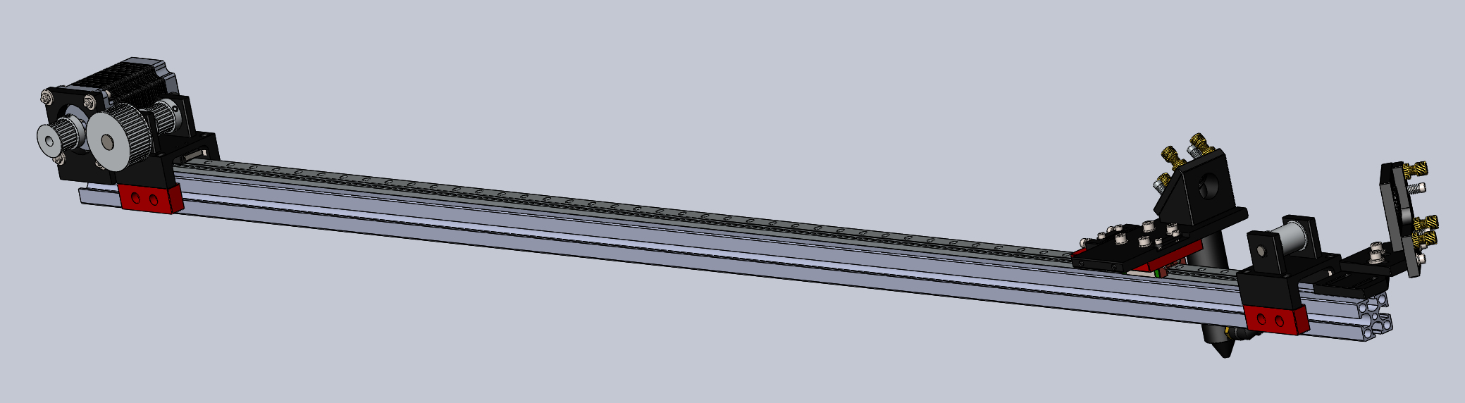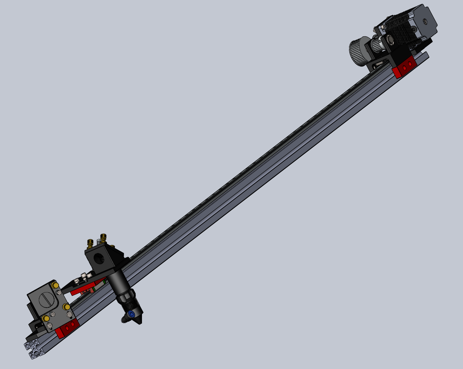 Начал компоновать ось Х. Всё же решил использовать профиль 30х30. Красным цветом те детали, которые надо будет резать и фрезеровать под заказ... Кстати, вопрос. Есть ли в солиде возможность сделать сборку одним файлом? То есть сохранить так, что бы все данные о компонентах сборки были в одном месте? Что бы я расшарил один файл и не пришлось народу докачивать разные