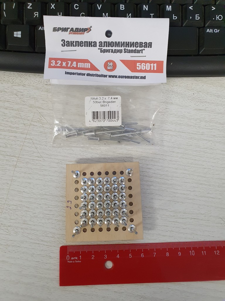 Собираю себе лазерный станочек. Понадобился какой-то недорогой стол, что бы можно было настраиваться. Решил сделать игольчатый из вытяжных заклепок и 6мм фанеры. Купил на рынке 500 заклепок за около 5$, фанера была из старых запасов. Насверлил отверстий с шагом 25мм. Т.к. отверстия были с запасом, то заклепки болтались, как трава от ветраПосле того, как посадил их на герметик - все стабилизировалось.