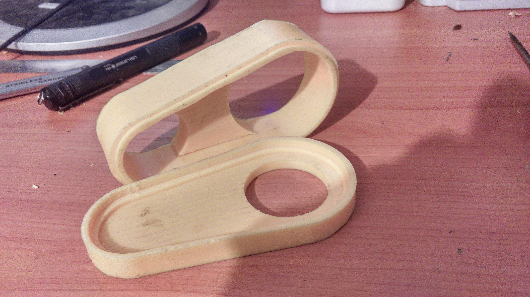 Сегодня от фрезеровал из пластика самопылесос состоящий из двух половин,во время фрезеровки второй половины вырубили свет когда включили подогнал как мог в итоге ошибся по высоте примерно на 1 мм не дорезал на сквозь и замок одной половины получился меньше.