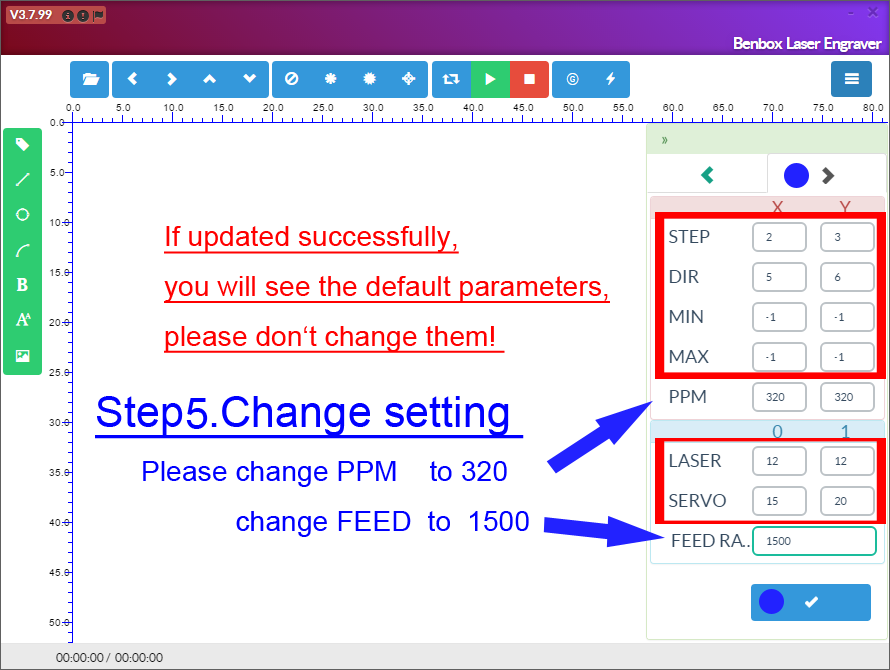 Попробуйте переустановить все драйвера и приложение бенбокс. Потом настройте Бенбокс, как показано на картинке. Только в поле Laser введите число 11.