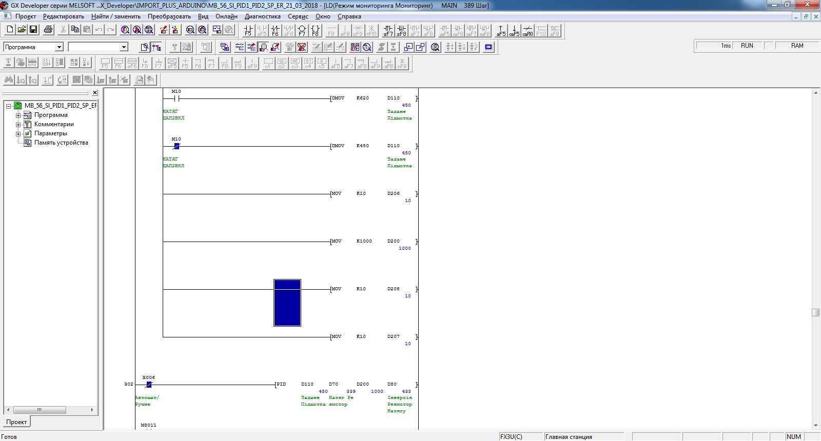 Архив проектов Gx , FlProg , Arduino 1.8.1 . Железо - клон FK3U ( https://www.ebay.com/itm/PLC-FX3U-24MR- ... 2107867965 ) , Arduino Mega , LCD 1602 и 485 шилд . Передает через Modbus кольцо данные от входов Х00 -15 ПЛК FK3U через Arduino Mega на выходы У 00 -10 ПЛК FK3U . На ЖКИ отображается состояние входов и выходов и факт ошибок связи Модбас .