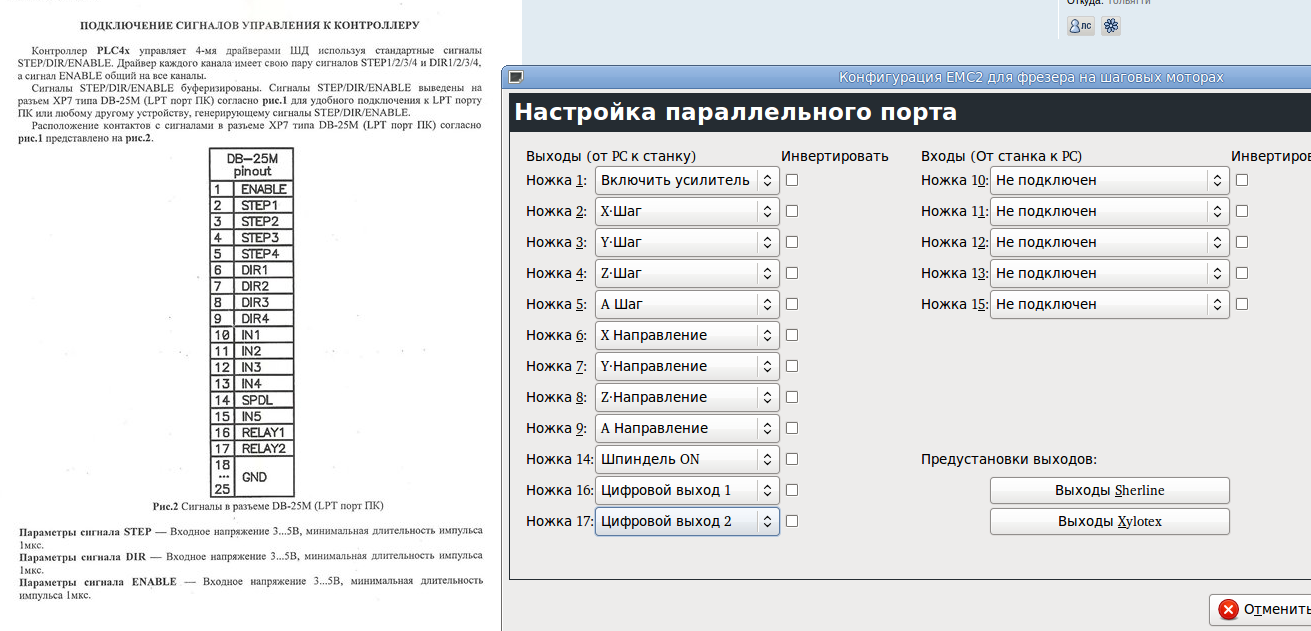 Решил попробовать EMC. И сразу уперся деревянной головой в настройки. Не подскажете как правильно пины настроить и и у двигателей(PL86HD151-4.2) выбрать шаг и т.д.