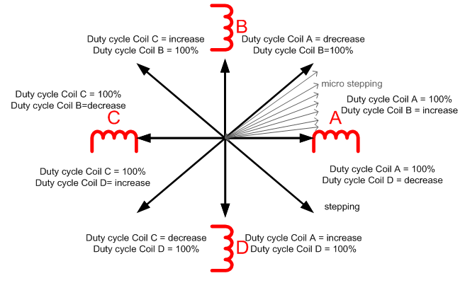 Результирующий вектор есть диагональ прямоугольника - его стороны - это токи в катушках. при полной запитке обеих катушек диагональ максимальна - это полношаговый волновой режим. в режиме дробления шагов стороны прямоугольника уменьшаются и, как следствие, падает момент шага.
