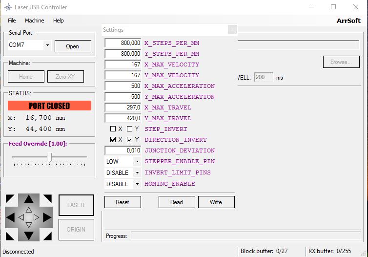 DJD, мой контроллер никогда не оставит лазер включенным, и если лазер выключается значит программа больше не отправляет данные на контроллер. Что значит программа не выдает ошибки и не реагирует на кнопки? Статус какой? IDLE или CONNECTION LOST?