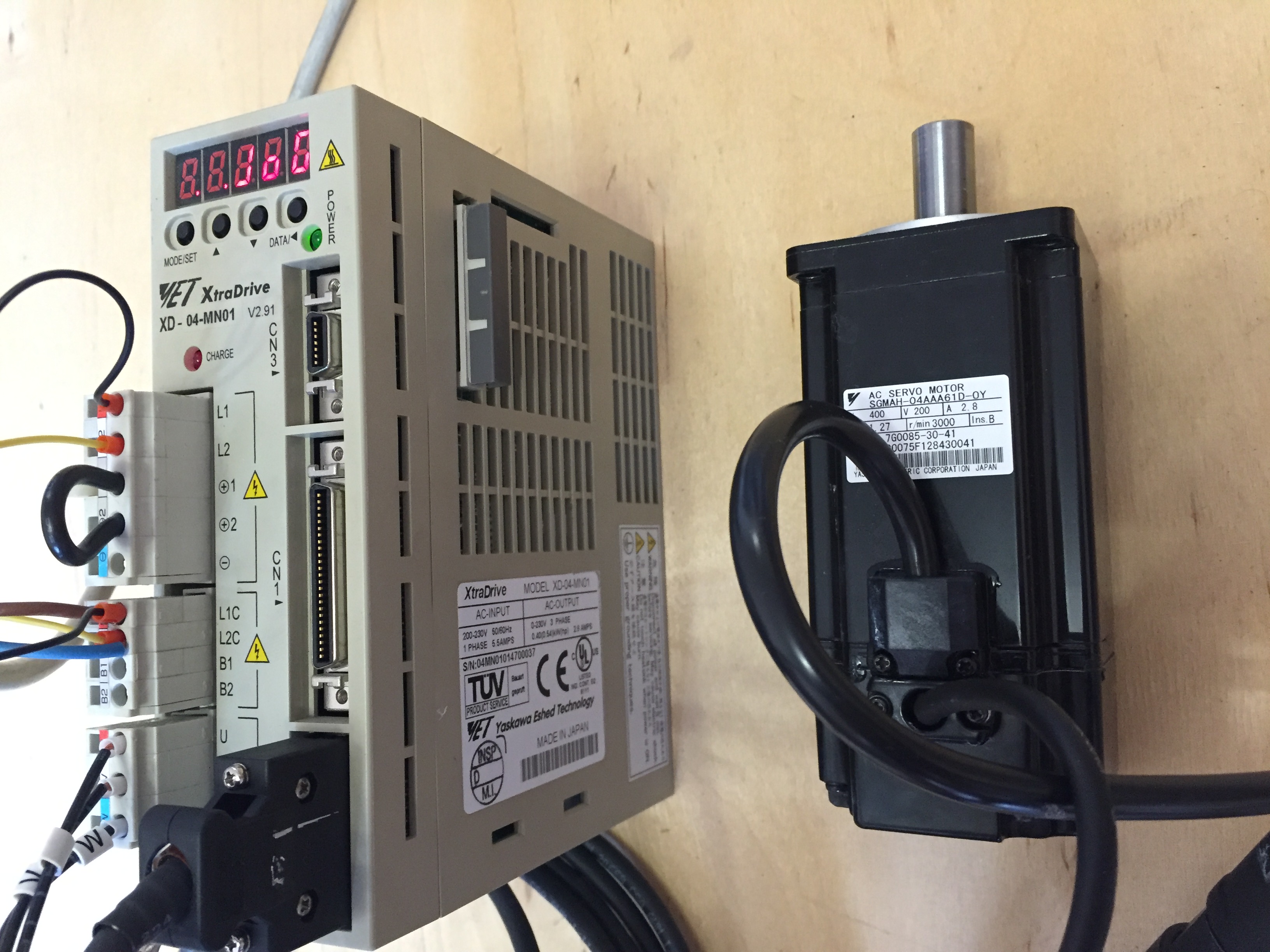 2. Привод Yaskawa Xtra Drive XD-04-MN01 он же Yaskawa Sigma 2. Отличие в том что на борту Xtra Drive есть дополнительно встроенный контроллер позволяющий писать программы управления движением, в остальном это чистый Sigma 2. Привод под нагрузкой не работал. Понимает и аналог и step-dir. Моторы и кабели 100% подходят и родные и от Sigma 2.