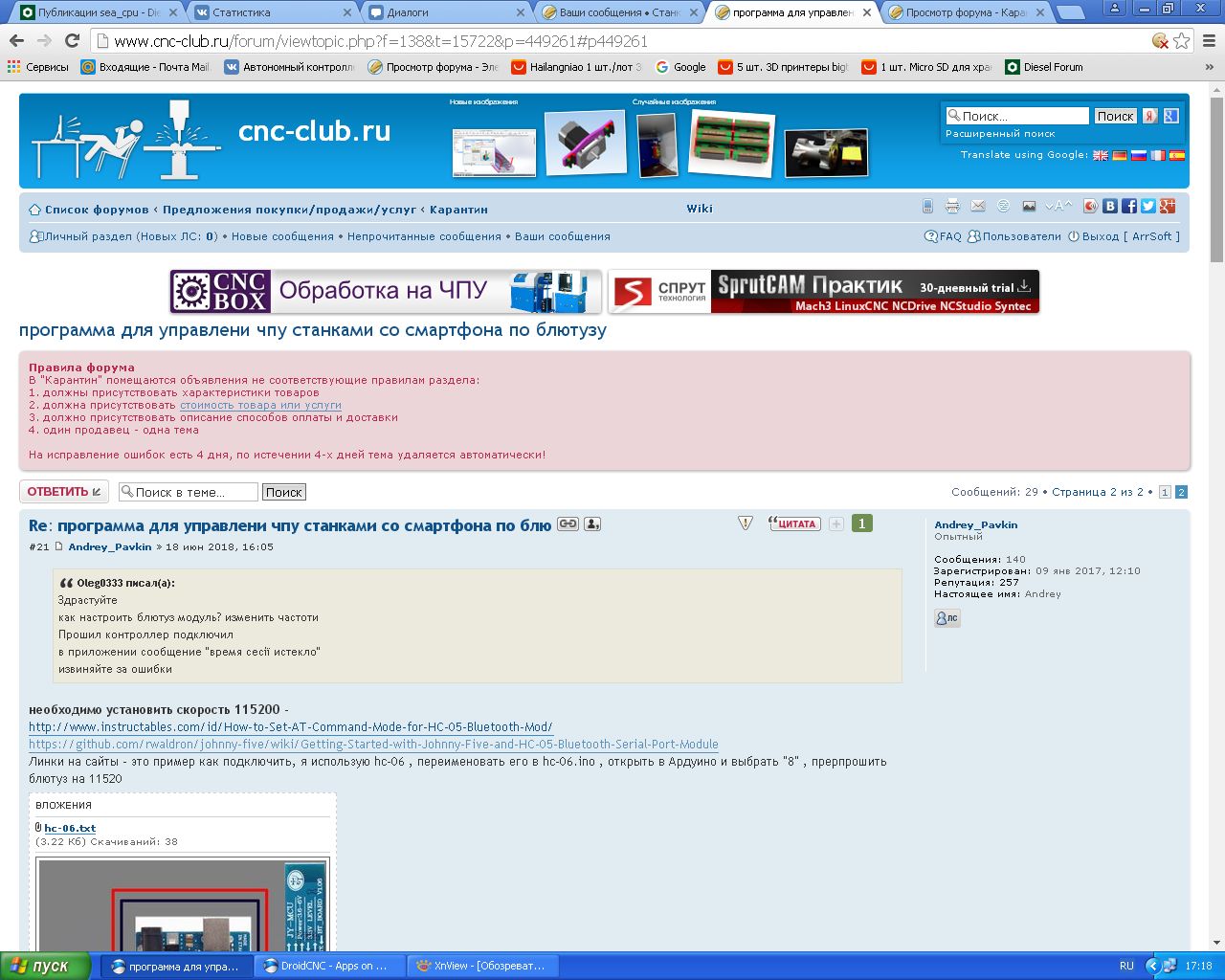 ArrSoft, я совершенно не хотел Вас обидеть. Вот ссылка где написанно про платную версию и символическую плату. https://sites.google.com/view/arrsoft/% ... /droid-cnc Доходите до момента ссылки где нужно скачать программу для фрезера в полной версии и читаете строчку ниже. Я же не знаю, может у Вас есть более продвинутая программа для cnc станков. Там же указан счет для пожертвований на развитие. Более того скажу что готов пожертвовать, потому что тема для меня интересная. И не вижу ничего в этом плохого. Любой труд должен быть оплачен. Если я Вас обидел - Прошу меня извинить! Не со зла!