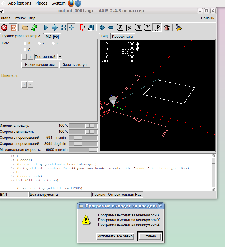 У тебя лимиты настроенны так, что минимальный лимит 0,2мм, лучше сделай минимальный лимит в 0, а концевик расположи в -1мм, тогда программа будет работать нормально, или нужно переписать последнюю строчку G00 X0.0000 Y0.0000. Так же предел по Z, у тебя они 0-10мм. Здесь идет заглубление ниже 0. Обычно делают уровень касания материала инструментом равным 0, так проще ориентироваться. Т.е. либо