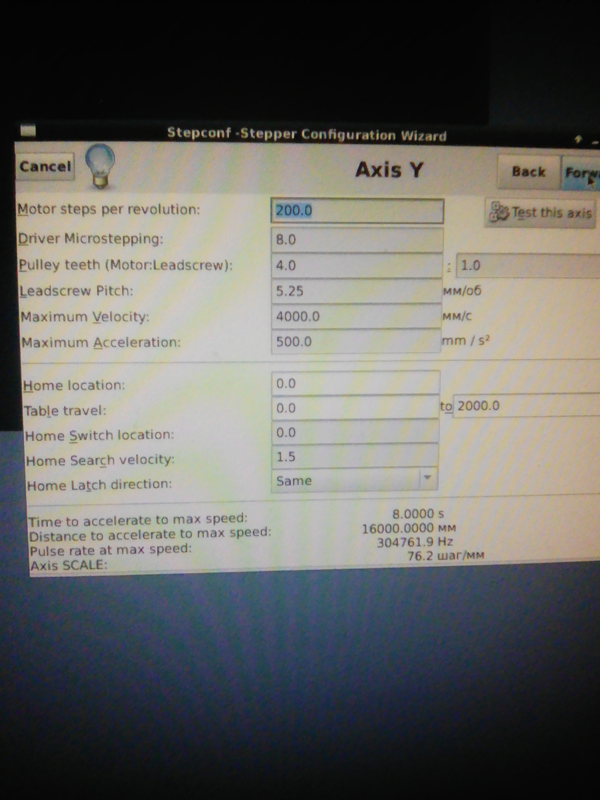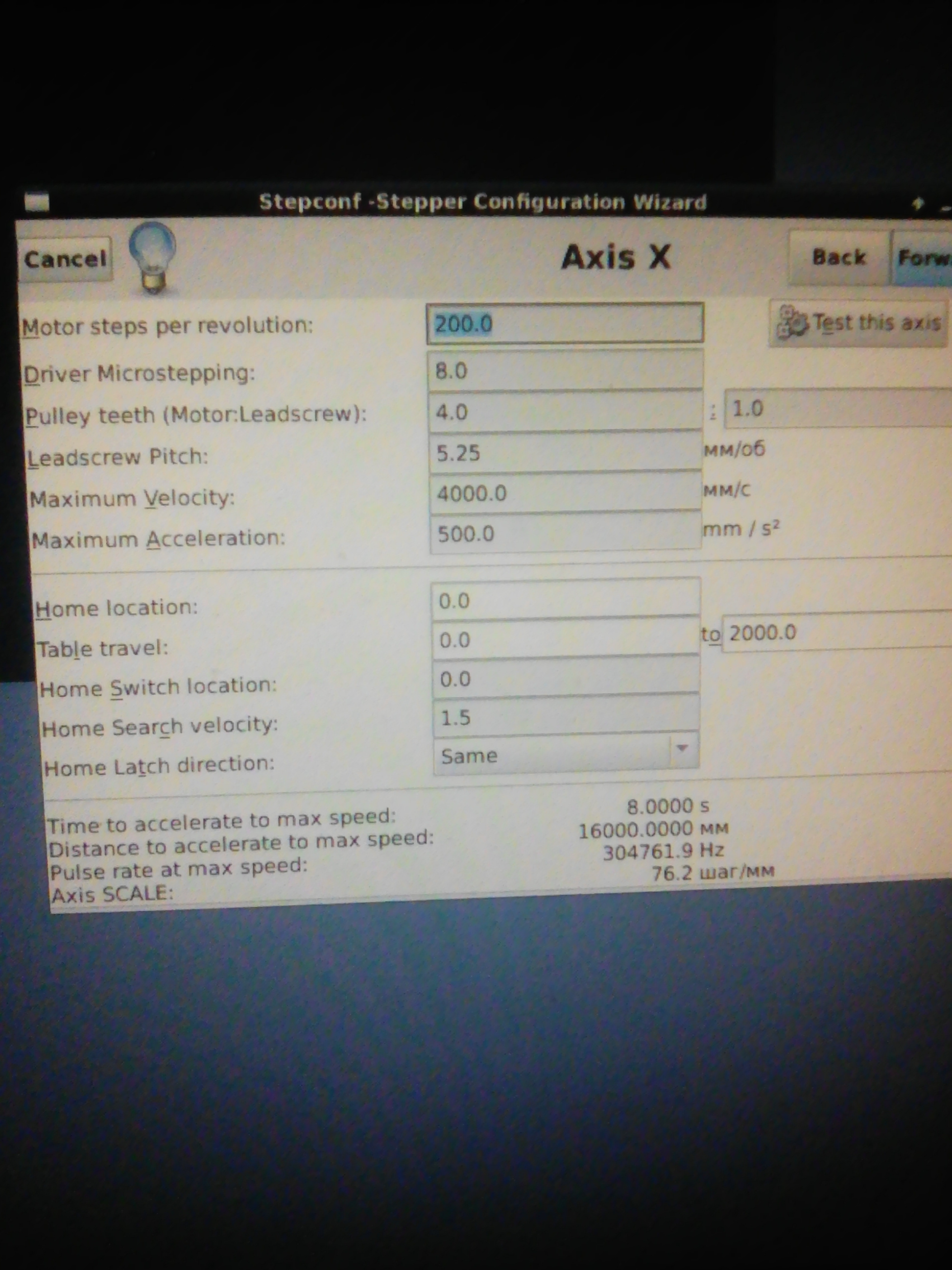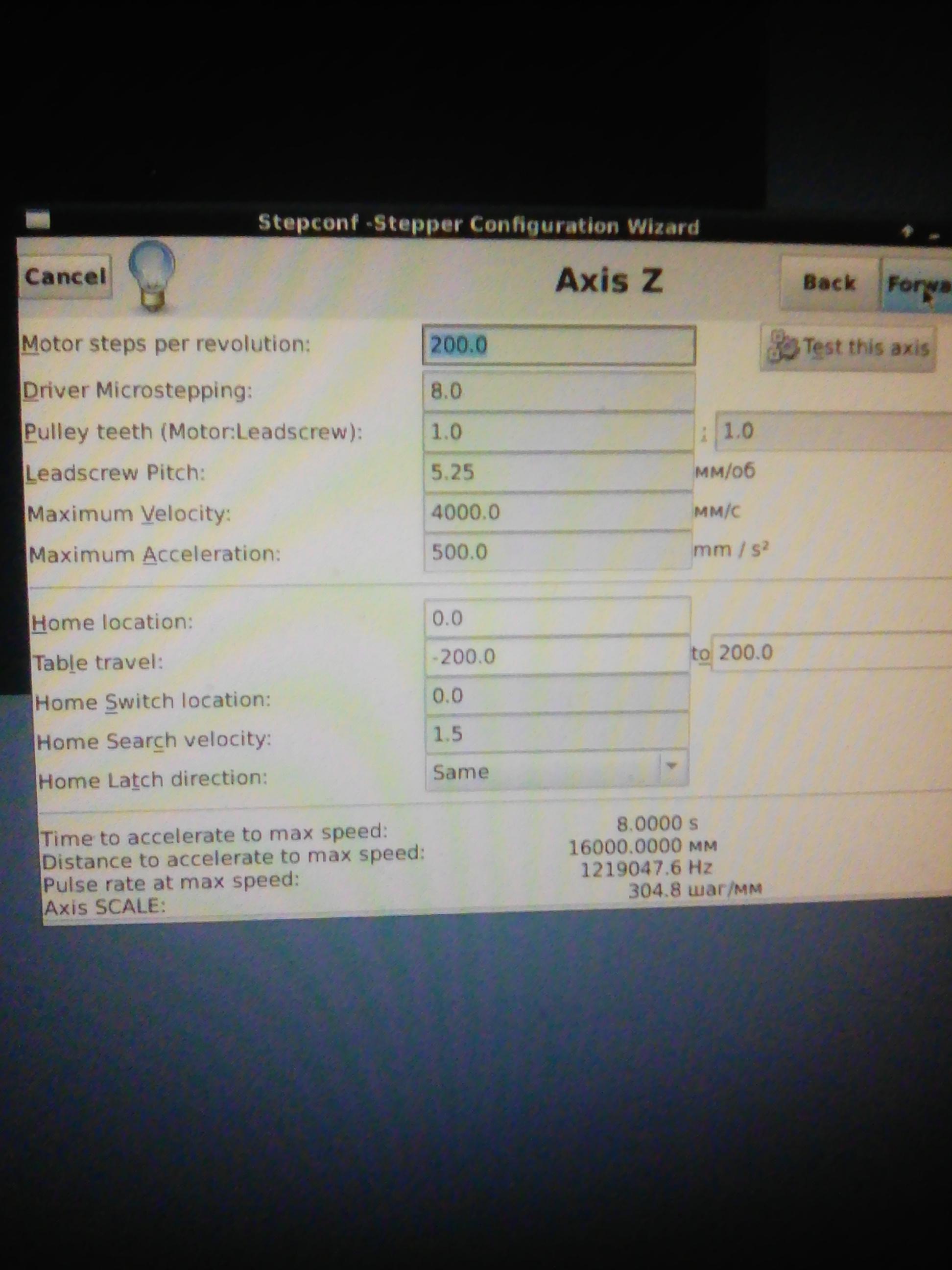 При настройке надо обязательно делать тест оси - у каждой оси есть кнопочка протестировать. И да, 4 метра в секунду... хотелось бы видеть такой привод да с такими ускорениями.