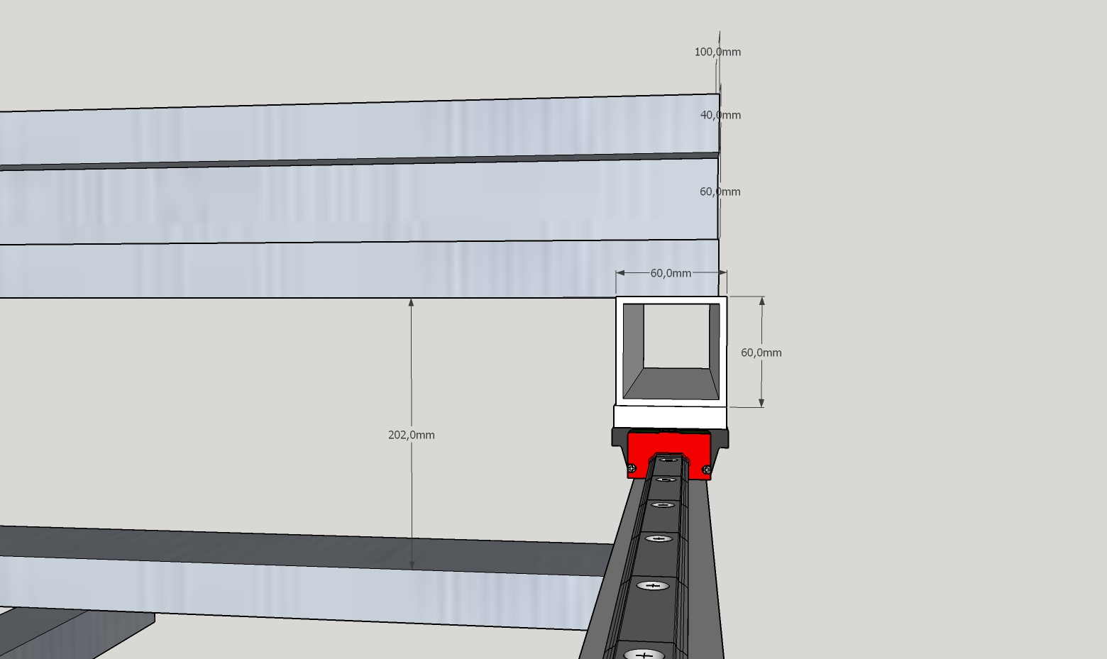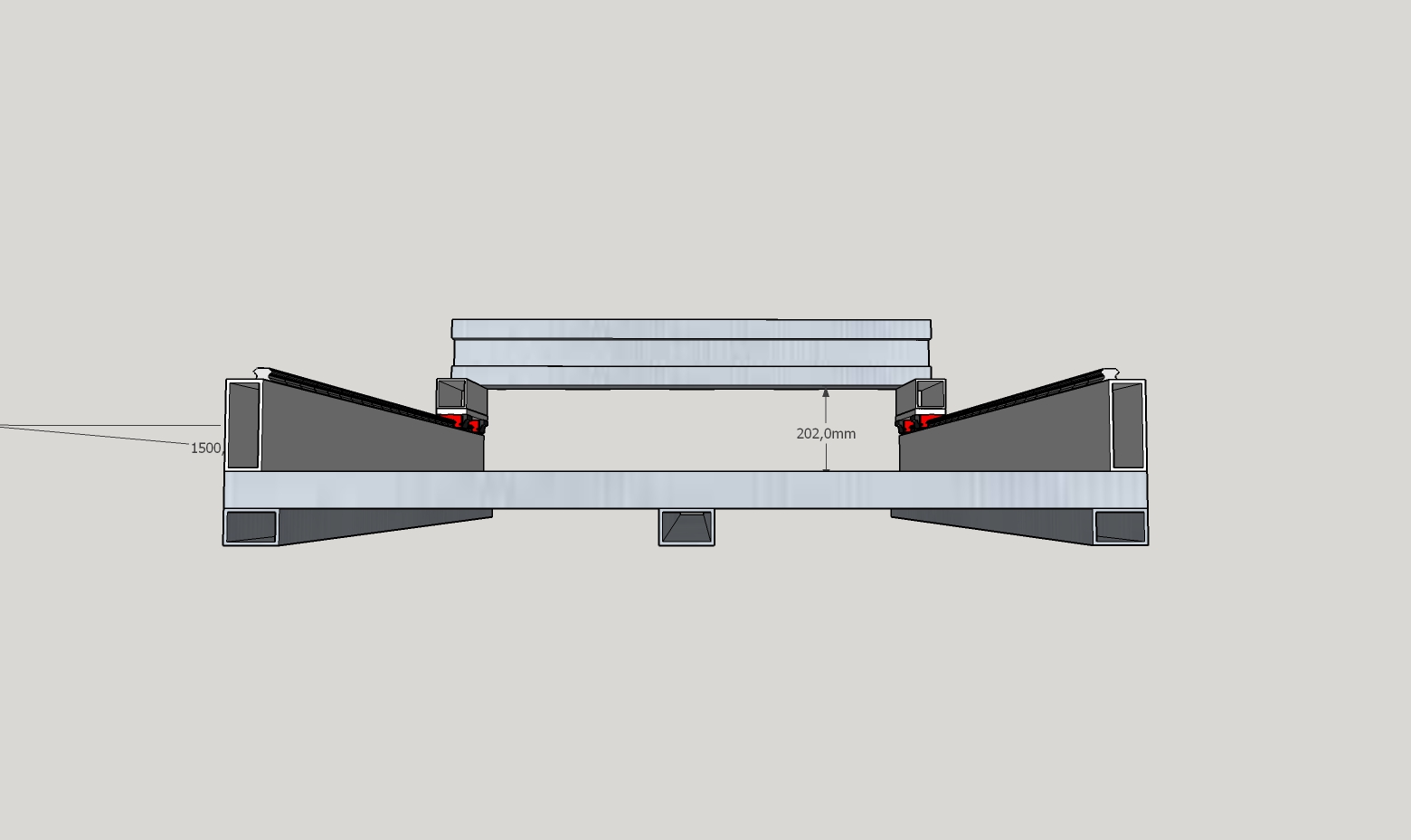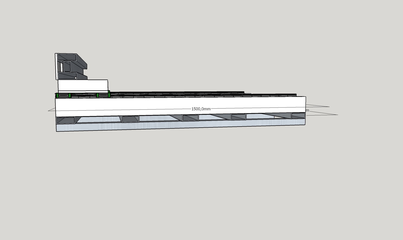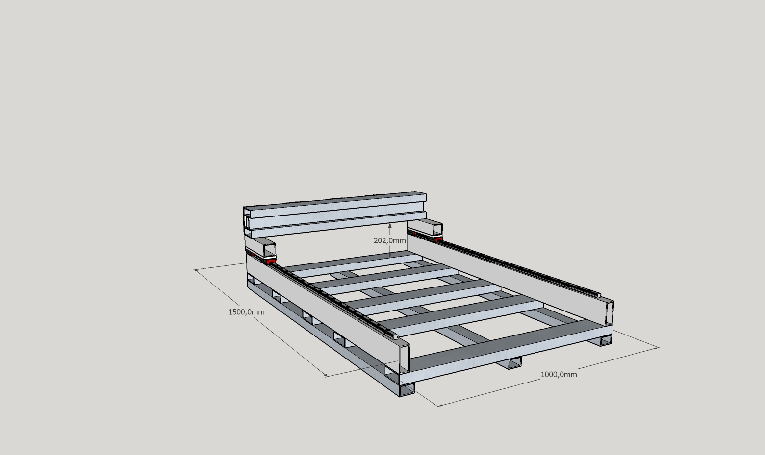 В основание кладутся 3 Алюм Бокса 60х40х4 L=1500мм на них перпендикулярно 5 боксов 100х40х4 L=1000мм и опорами под рельсы и крепление ШВП боксы 100х40х4 L=1500мм