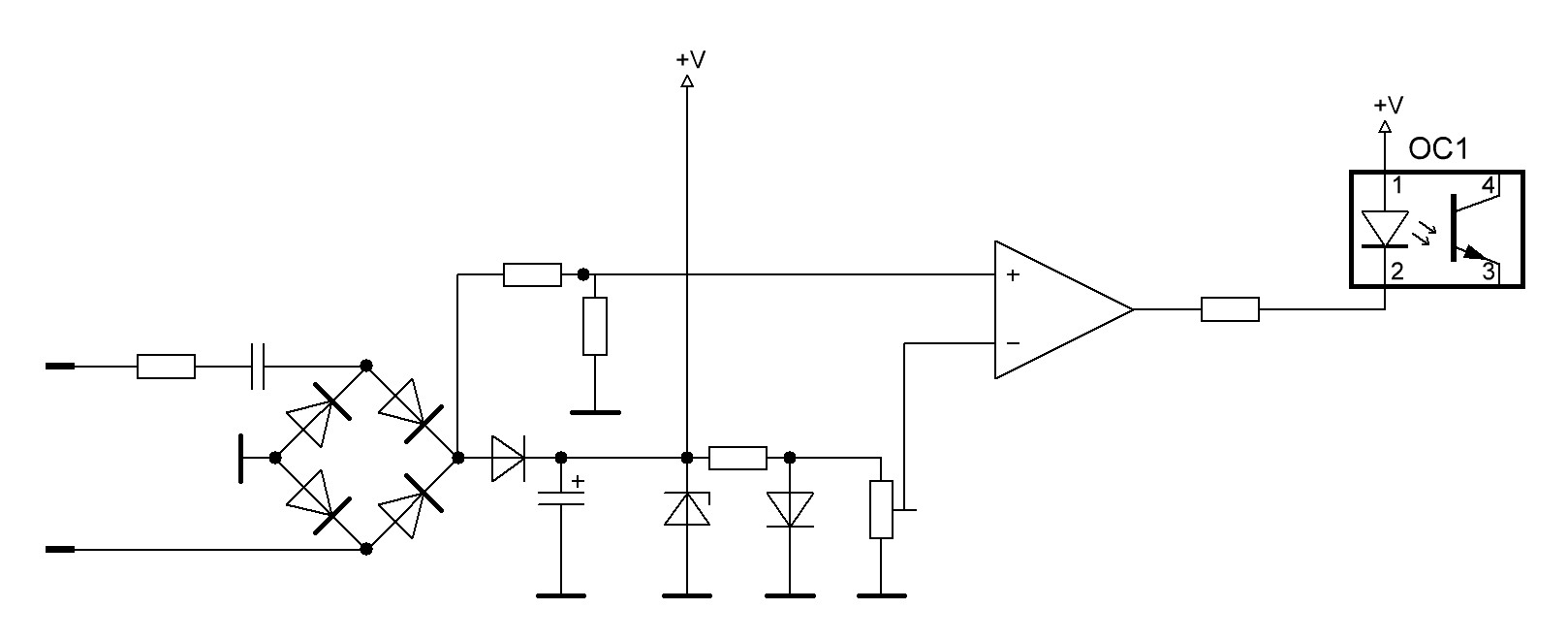 Да, такая схема - самое простое решение, но оно мне не нравится. Во-первых, нужно рассеивать почти ватт тепла на резисторах, а во-вторых на выходе оптопары сигнал будет появляться с задержкой и эта задержка будет зависеть от напряжения в сети. Тогда как с операционником мощность, выделяемая гасящей цепью (R1+C1) меньше 15 милливатт и задержка не зависит от сетевого напряжения. У меня же не стоит задача сэкономить 10 долларов на партии 100 штук :)