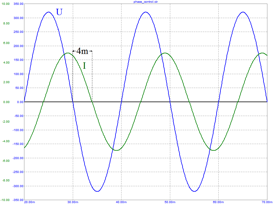 Как известно, в индуктивной нагрузке ток отстает от напряжения на некий угол, который можно выразить и во временнЫх единицах: