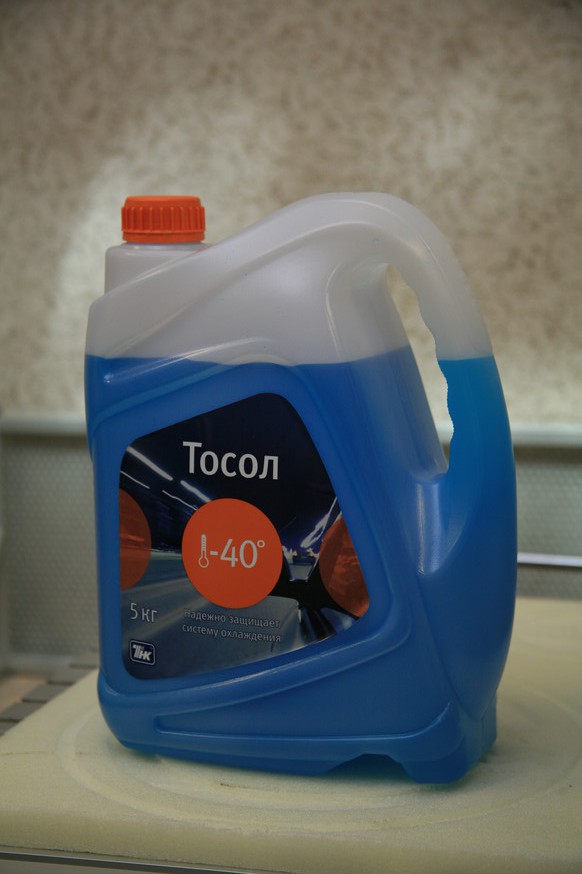 По дороге домой затарился тосолом -- производитель рекомендует использовать в качестве охлаждающей жидкости тосол, разбавленый водой 1:1.