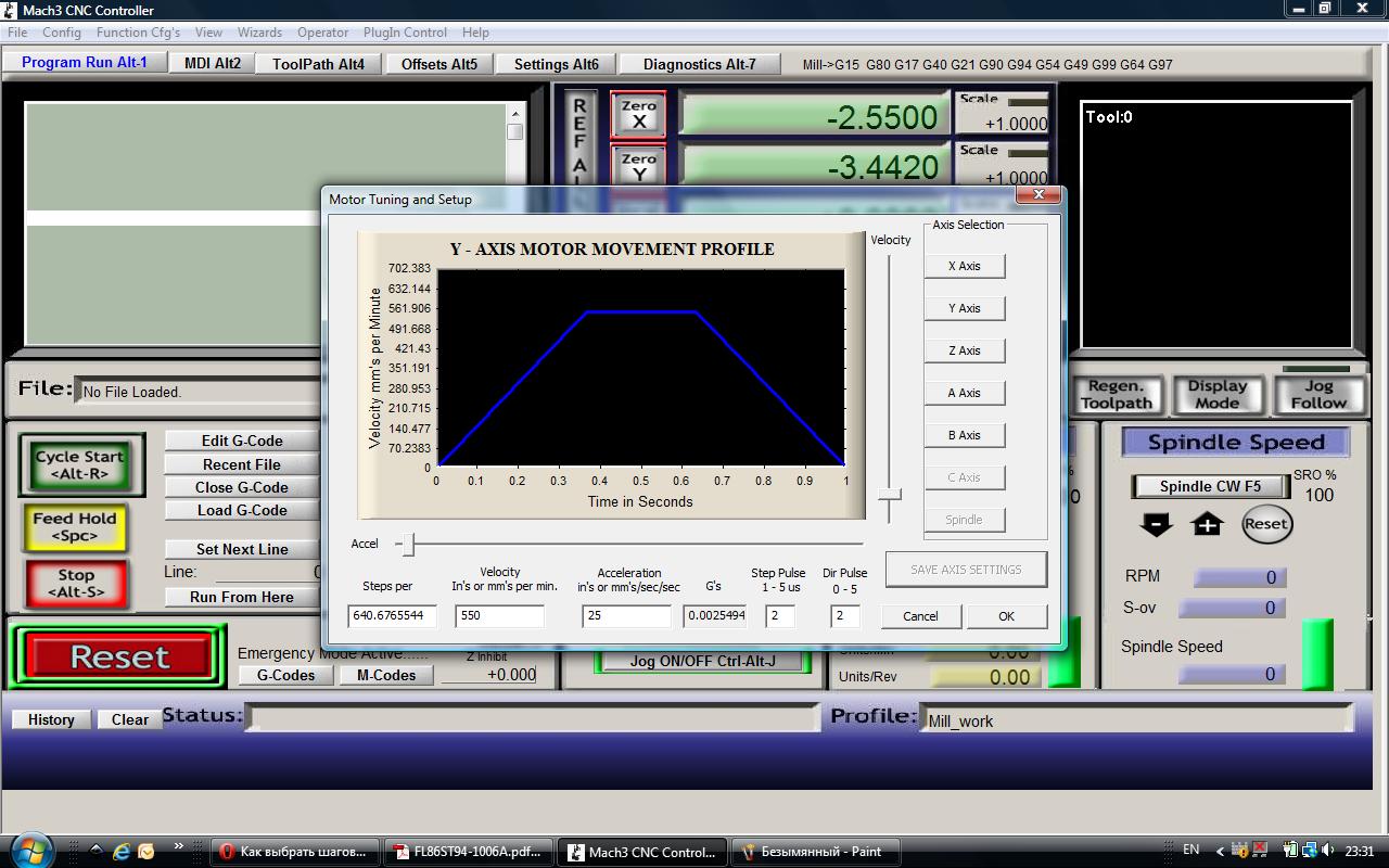 Nik: вот фото станка и двигателей. седня пробовал поставить 'Step dir 1, Dir Pulse - 0, получилось разогнать до 850 мм/мин только при нагрузке-вал. при подсоединении шпинделя с креплением перемещения без пропуска шагов возможны только при 550 мм/мин. Fisher : при 640 шагов на мм получается максимально разогнать двигатель без пропуска шагов, т.е. получается самый оптимальный режим его работы в данной конструкции.