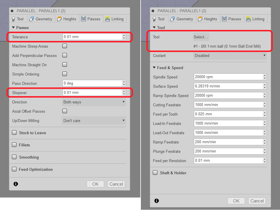 Поставил Tolerance = 0.001. Расчёт траектории занял те же 5 минут. В постпроцессоре тоже выставил Tolerance = 0.001. Постпроцесс занял около 15 секунд. Итоговый файл УП получился размером 215 Мб. Кстати, это всё я на ноуте делаю, где процессор и видео медленней в 2-3 раза чем на настольных ПК.