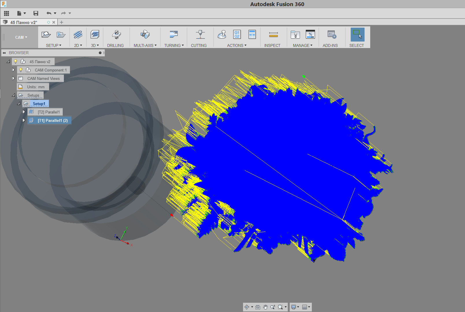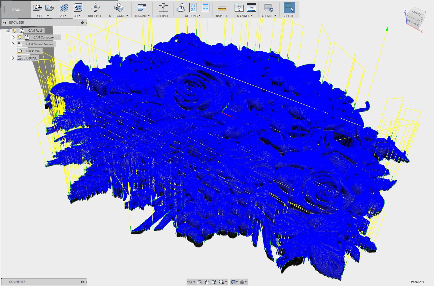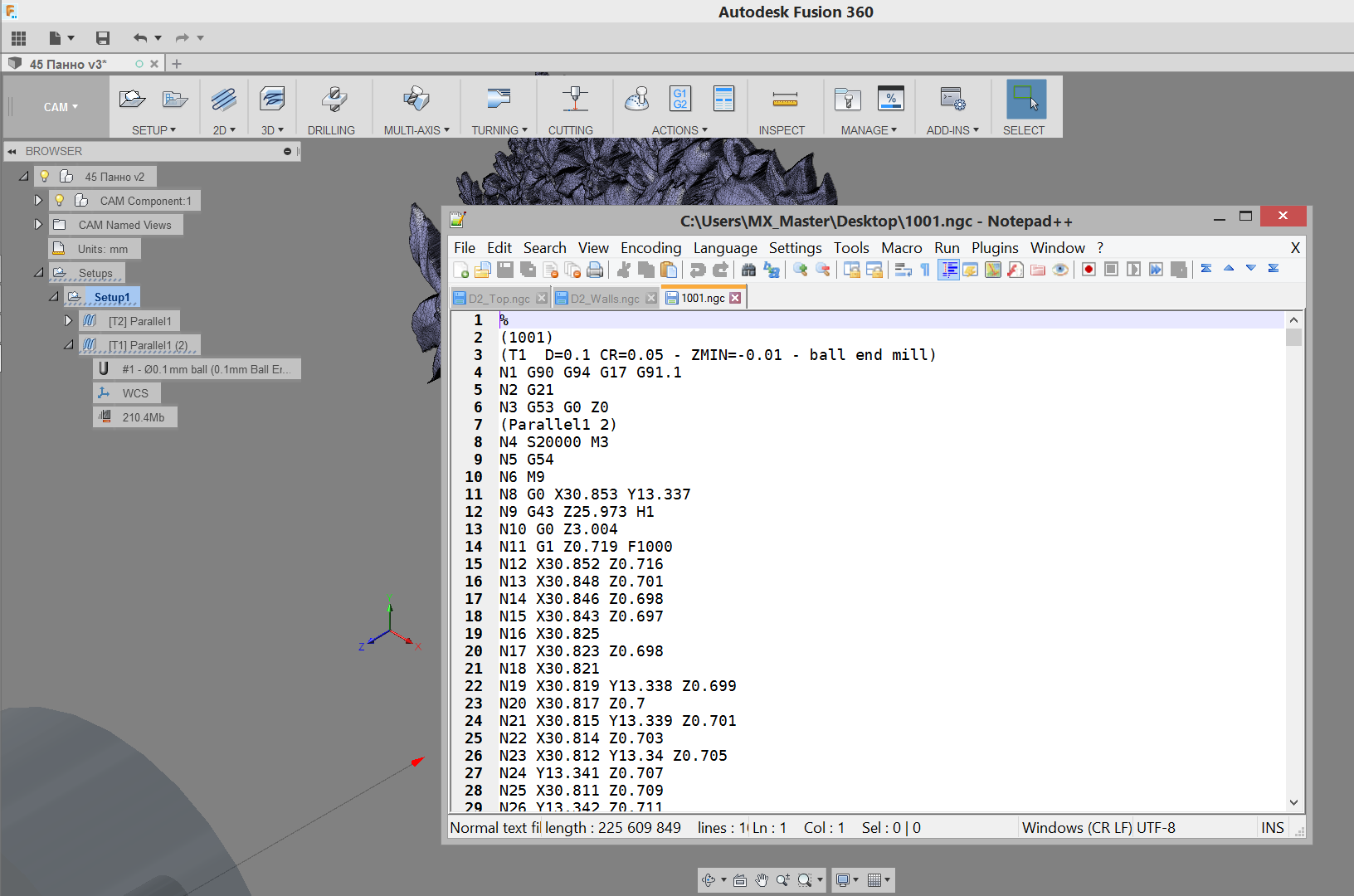Размер, грубо говоря, 95 х 75 мм. Попробовал радиусной фрезой 0.1мм с шагом 0.01мм. Расчёт занял около 5-ти минут. Расчёт успешно завершился и модель вместе с мульёном линий реза фрезы нормально вертится-крутится в редакторе. Надо отдать должное прогерам из команды Ф360, оптимизация отображения на высоте.