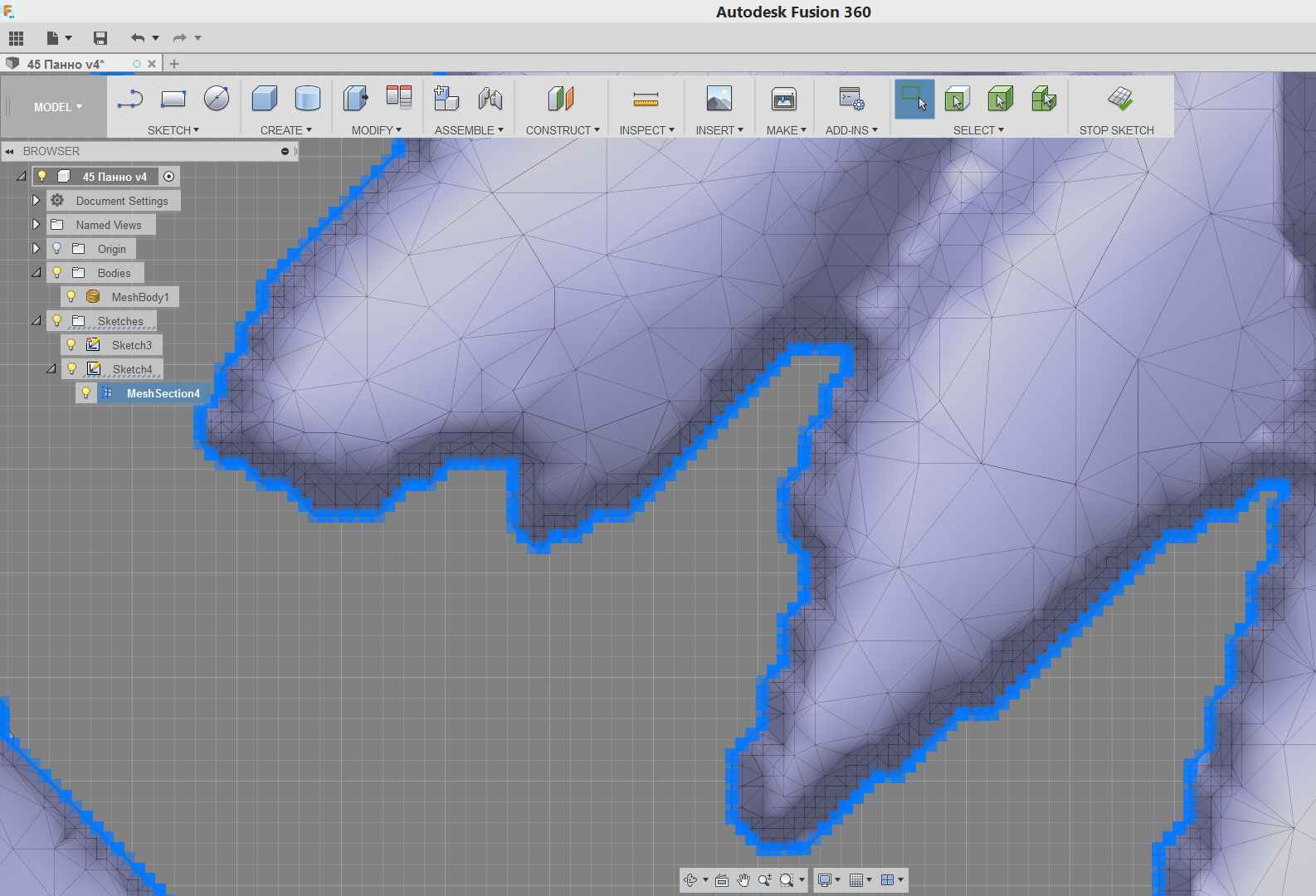 Есть такая штука.. во время работы со скетчем в меню скетча есть пункт Mesh -> Create Mesh Section. Эта штука делает срез сеточной модели на указанной высоте и вставляет в скетч контур этого среза. На очень детализированных моделях срез делает очень долго. Конкретно на этой модели - около 20 минут. Это ж мильён мелких отрезков в скетч добавились!
