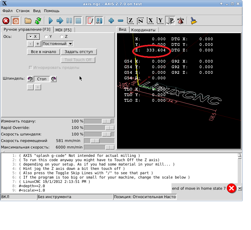 Сделал как Вы сказали. При нажатии кнопки "Все в начало", станок начинает движение по оси Z, доезжает до значения 333.604 (см. скриншот) и останавливается.