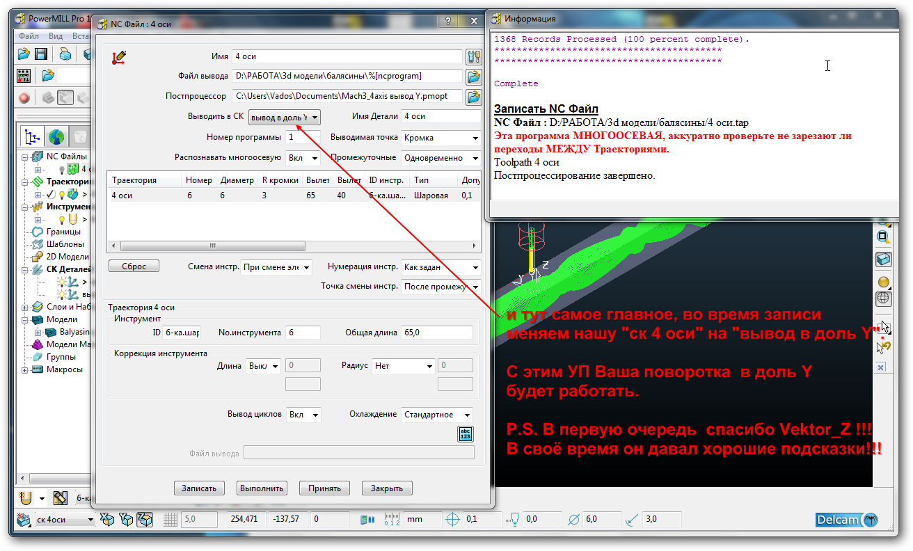 Ну так если станок с поворотной башкой, то кинематика должна конфигурироваться на в самой ЧПУ. Если же в стойке нет многоосевой кинематики, тут только один вариант - после установки фрезы, мерить вылет инструмента от оси поворота головы, и потом вносить эту длину в кинематику поспроцессора. Я так на станке под Мач3 запускал петиосевые траектории. Но тут один минус - поменял фрезу, пошел править вылет в постпроцессоре. А если станок с качающимся столом, тот тут один раз померить и можно всем хвастаться пятиосевой обработкой, только когда оператор захочет отвести шпиндель из отверстия вдоль вектора инструмента.... но тут наши полномочия уже все, того...NikolayUa24 писал(а):Нужно сделать точный замер Z-Pivot-Length от гайки шпинделя до центра поворотного редуктора.