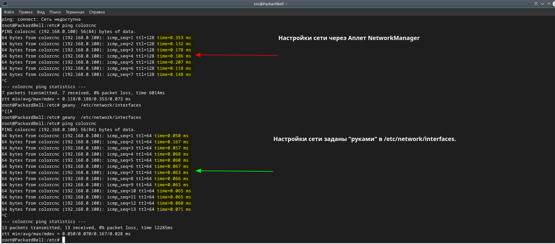 2.1 Запусить Latency test на компе, проверить биос на отключение всего не нужного (мультимедиа, энергосбережение, виртуализация и т.д), изоляцию ядер, удалить не нежные и висящие в фоне задачи (сервер печати cups и т.д), т.е. всё что отнимает процессорное время. Сетевой карте тоже нужно уделить внимание: если ядра изолированны - убедиться что драйвер/процесс сетевой карты весит на изолированном ядре, в противно случае скачать скрипт с форума linuxcnc.org, который будет сетевую постоянно пихать в изолированное ядро. Ну и вишенка на торте - сетевую нужно настроить руками, без Network manager. Он глючный, и даёт большие задержки. Вот пример: