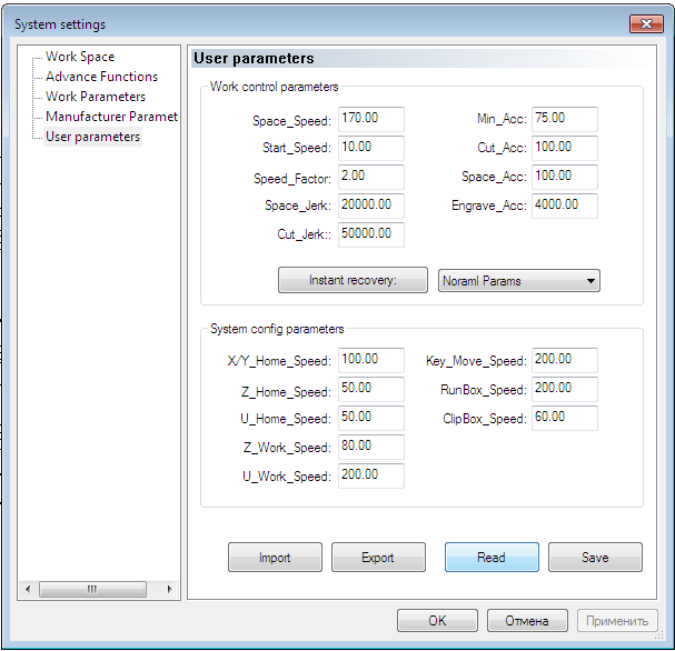 Спасибо, завтра (сейчас уже лень идти к станку) свои гляну, но ускорения я точно занизил, а перед этим пресет использовал "нормальные настройки", может там и порылась собака. Моторы то всё же не совсем для производства ( Но я позже заменю, отложил в корзинку и моторы и драйвера, просто не всё сразу. Тем более нужно победить и добиться хотя бы того, что было ранее.SNS писал(а):у меня пока такие настройки.