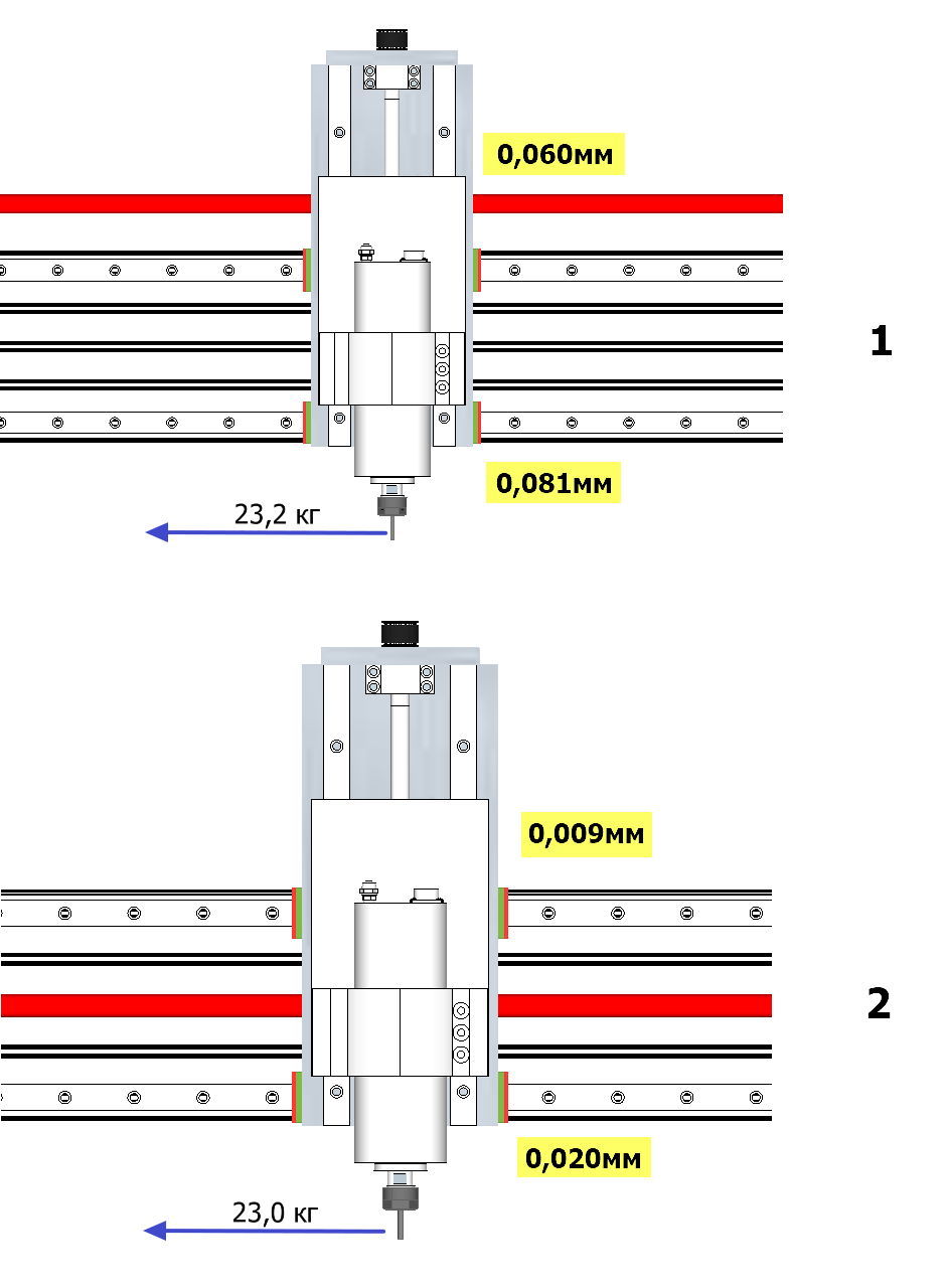 Странно...Вроде как, чем ближе ось ШВП к режущей части фрезы, тем меньше нагрузка на рельсы прочие детали конструкции. Да и деформации корректней бы мерить на самой фрезе.