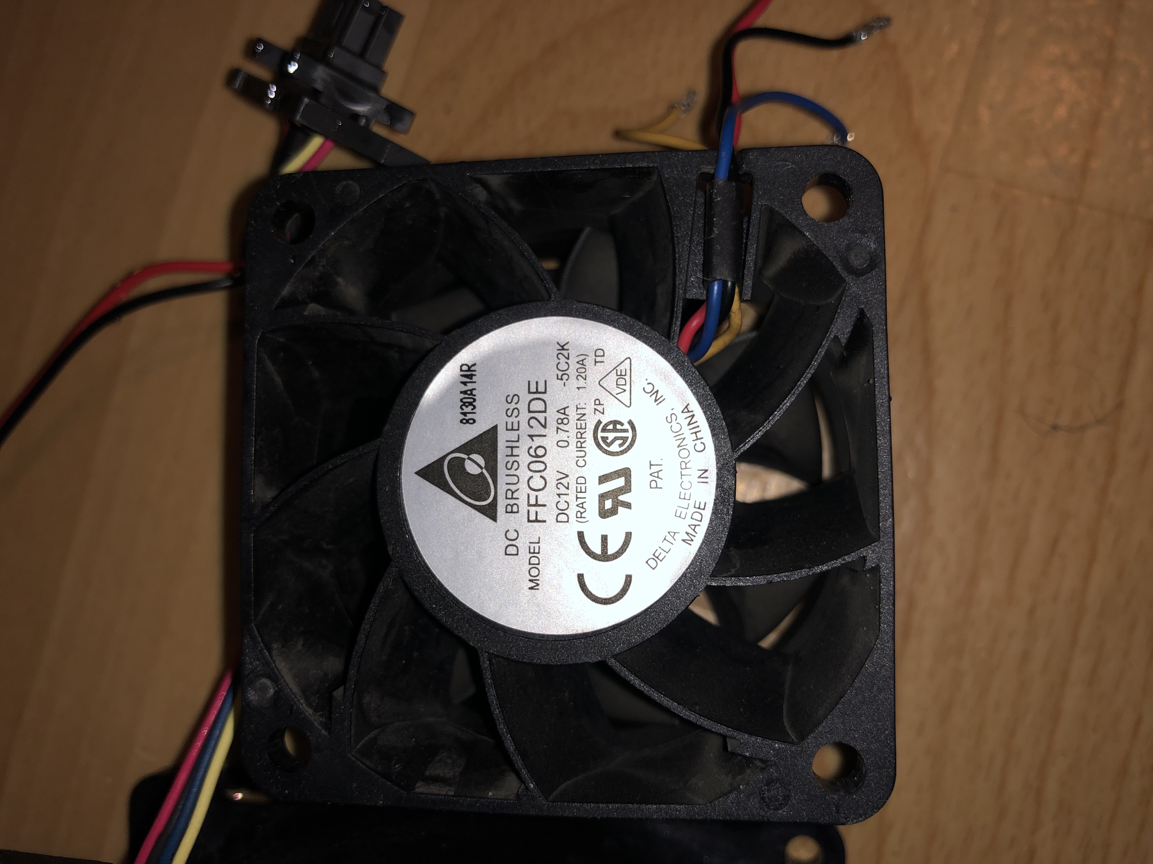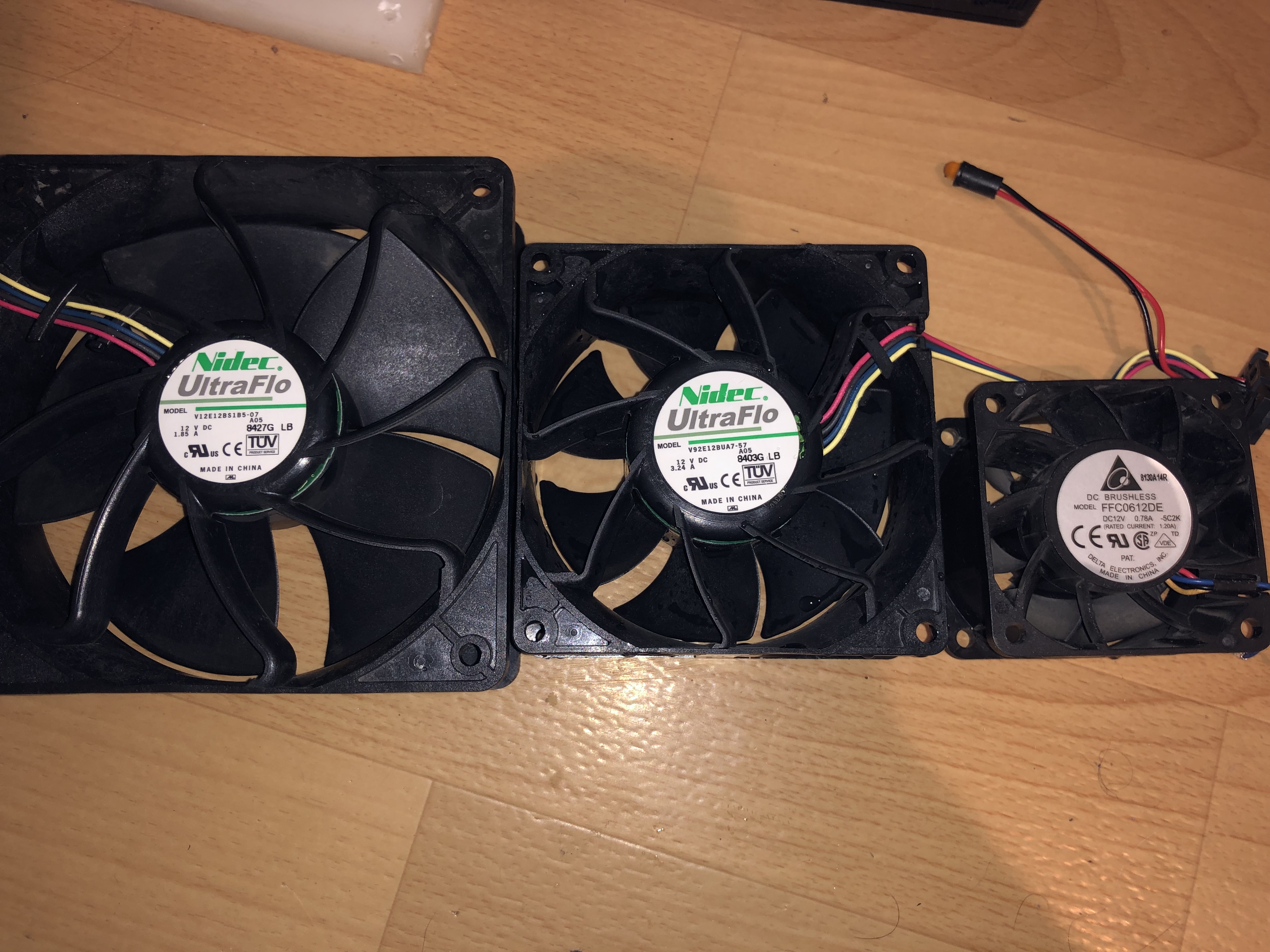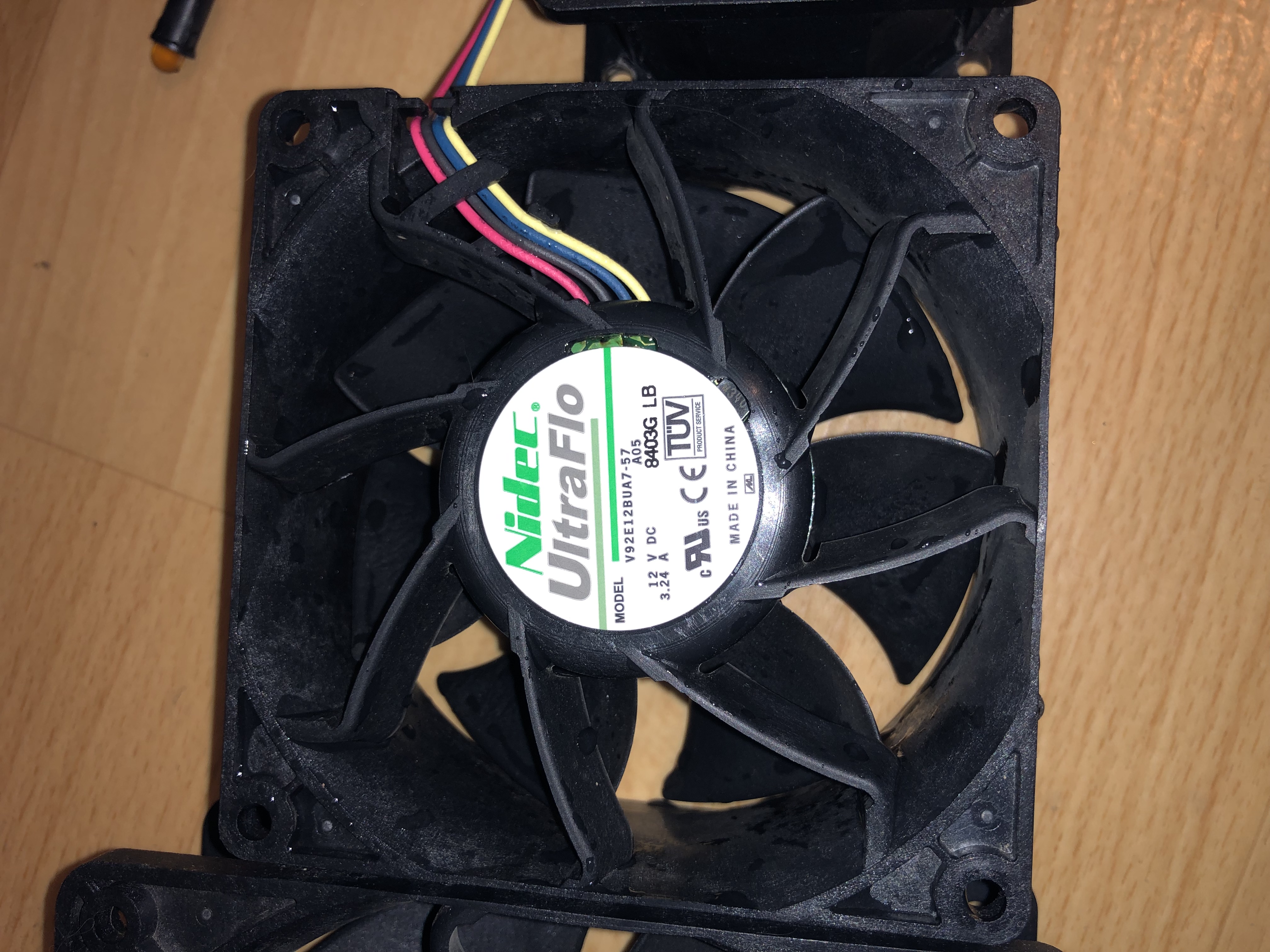 Средний 92х92х38мм v92e12bua7-57 12V 3,24А 8500об/мин 178CFM (по ощущениям он не слабее предыдущего)
