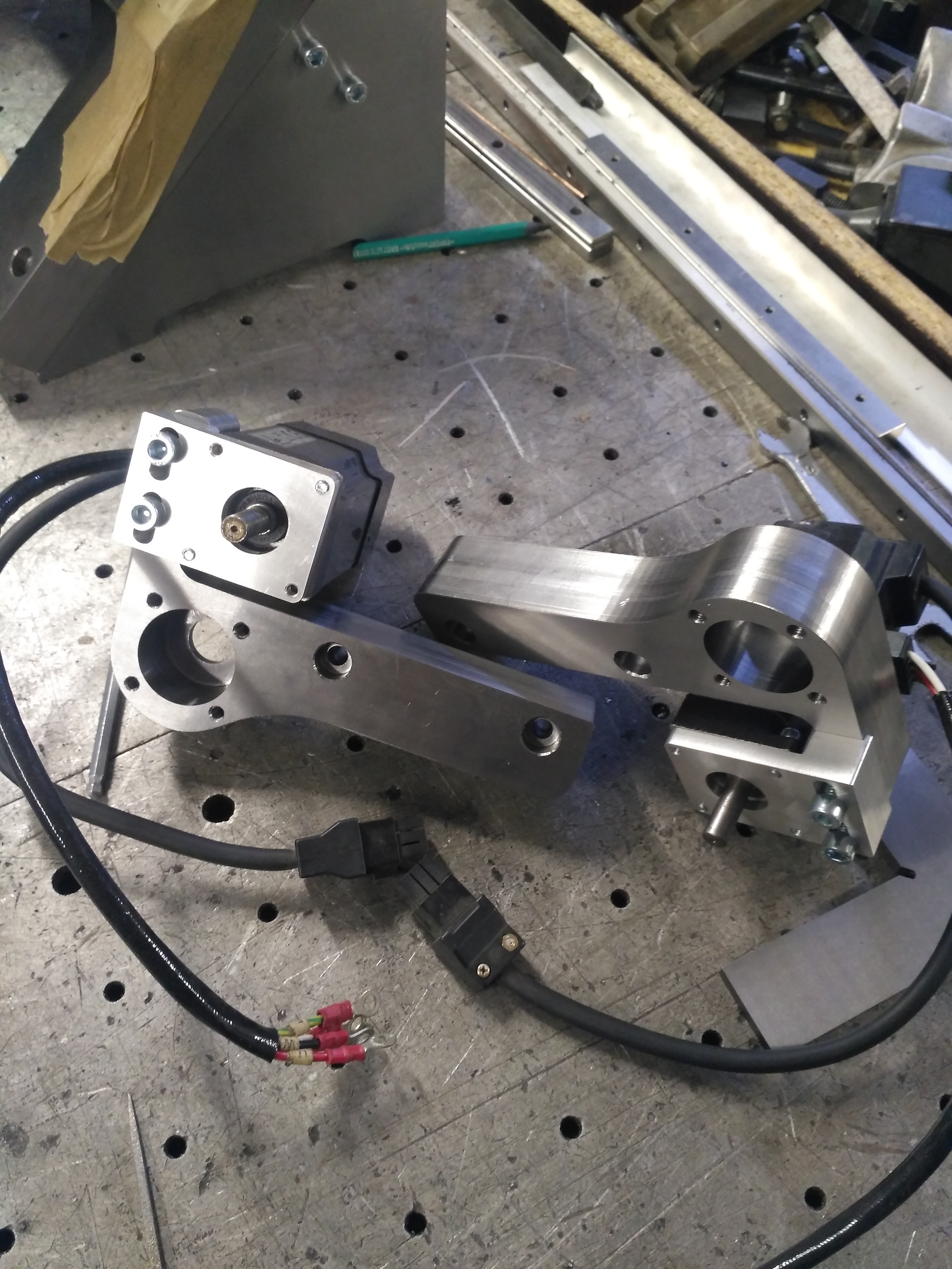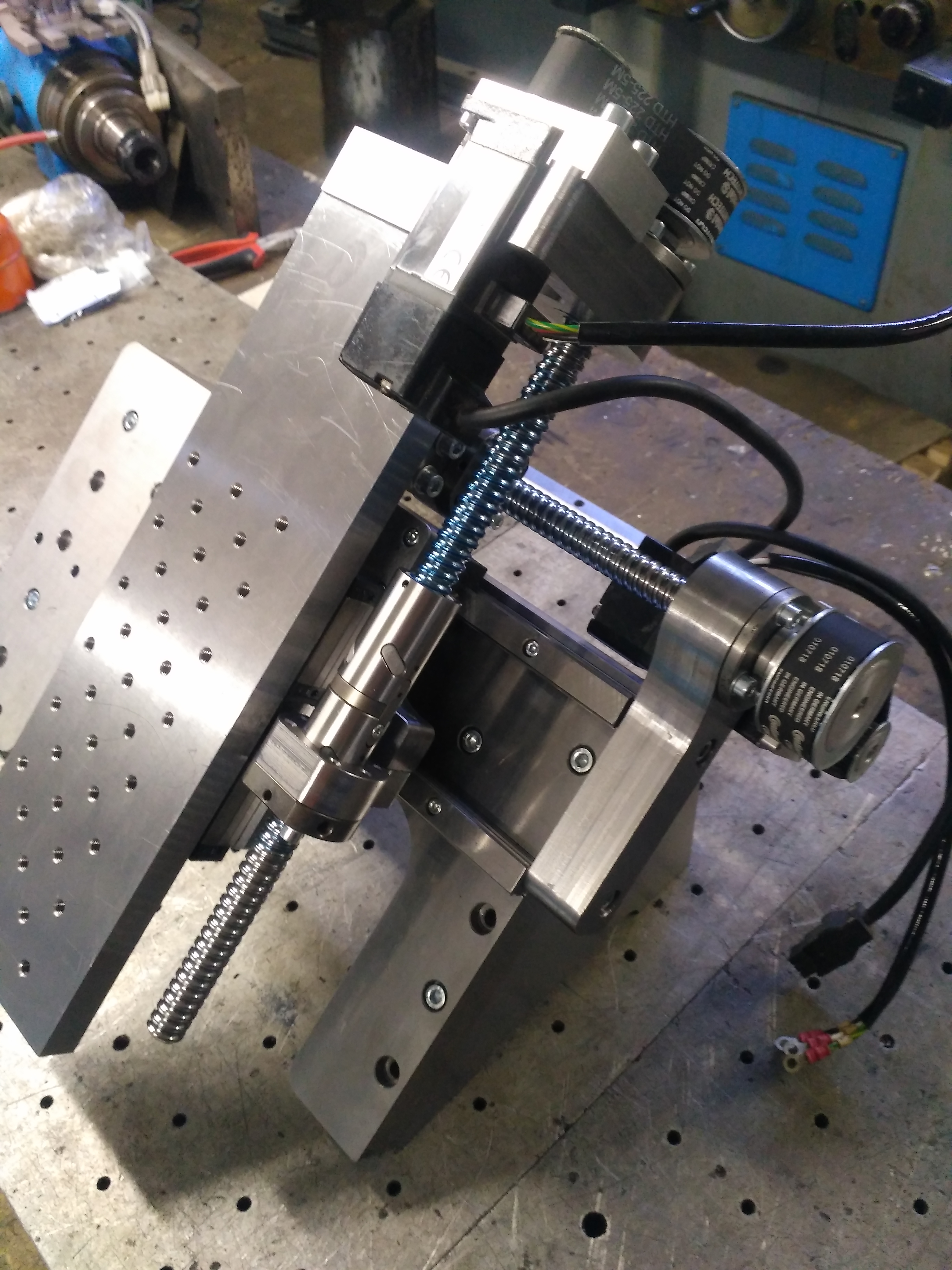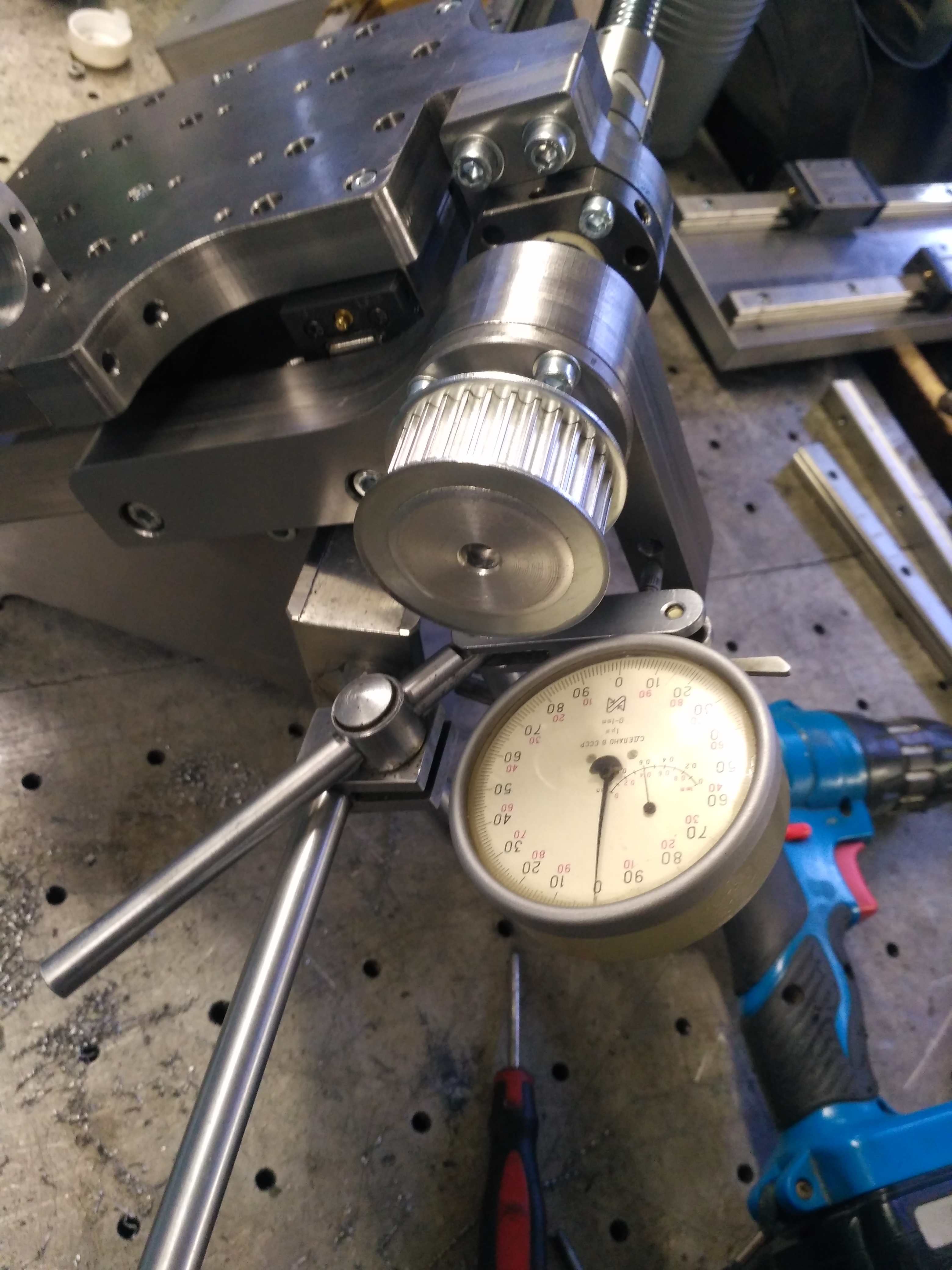Меня немного смущала консольная конструкция опоры винта ШВП. Сразу как собрал, решил измерить жесткость этого узла. В итоге руками с ровным усилием сам кронштеин не смог отогнуть больше чем на 1 микрон. В рывке стрелка до 2-х микрон прыгает. В общем то для этого станка это отлично. Сама ось не такая жесткая конечно. Получается отжать руками на 1 сотку в каждую сторону. Деформация упругая и после снятия усилия размер возвращается. В основном это прожимаются подшипники в опоре винта. Там дуплекс стоит радиально-упорный. Натяг не добавлял у него. Еще кронштеин гайки консольный наверное добавляет. Его не обмерял пока. Это конечно пока очень не точные измерения. После сборки все проверю тщательно и с одинаковым усилием.