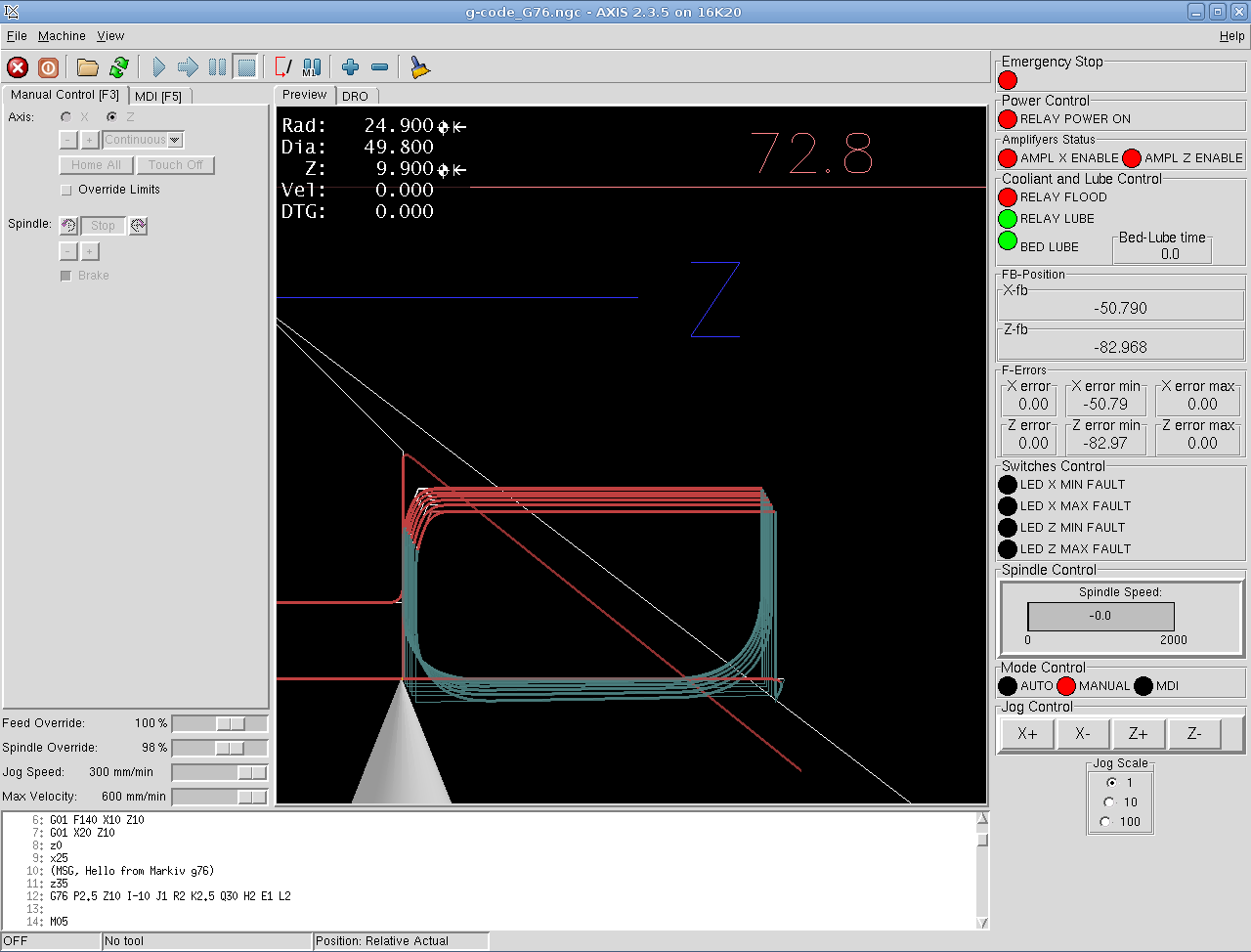 Вот о чем я говорил, при нарезании резьбы LinuxCNC подстраивает подачу под вращение шпинделя: