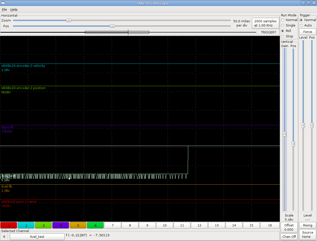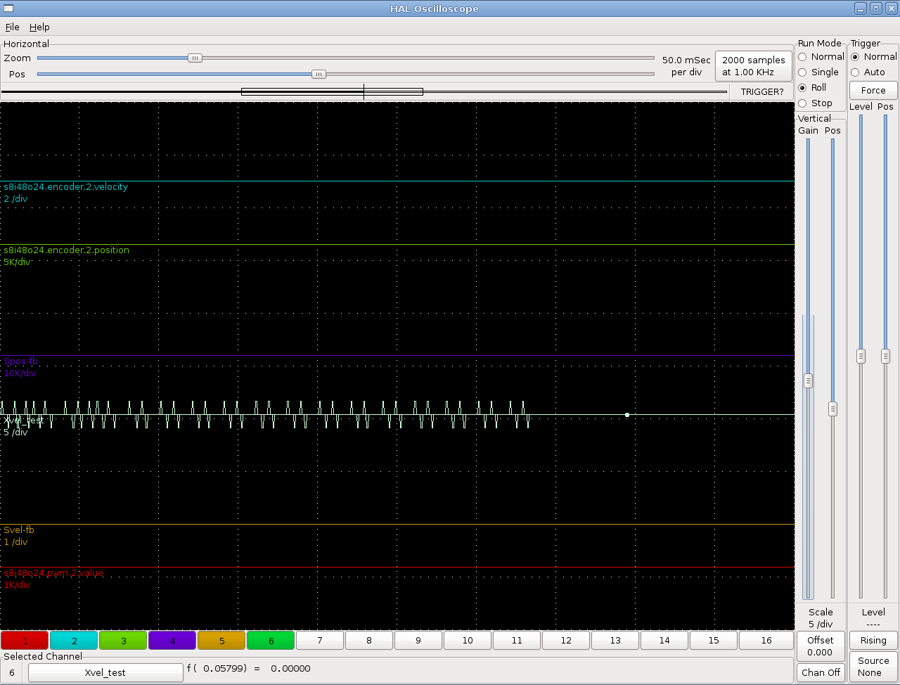 Опробовал и пробовал измерить характеристики каналов скорости сначала шпинделя , а потом и оси X .Скриншоты выкладываю . Видно что скачки в данных не зависят от амплитуды данных , есть некоторая переменная составляющая , я думаю , что версия Ника о считывании несинхронизированных данных наиболее правильная . Если б неравномерность была только в шпинделе - вопрос был бы интересным , но по оси Икс по скорости аналогичная картина . Или , вопрос по передаче данных в моей Плуто-подобной плате .