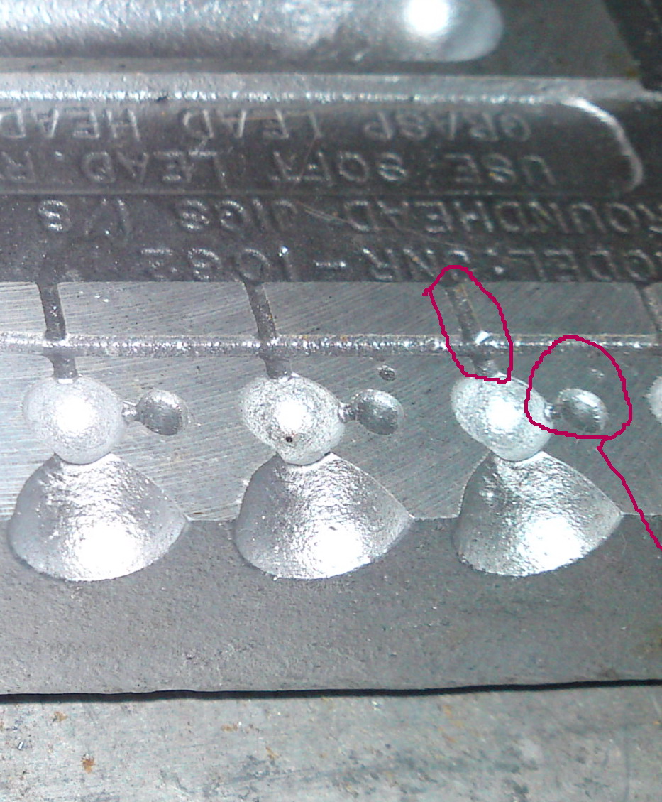Форма убивается не от нагрева, а от расшатывания шарнирных соединений верха и низа формы и разбивается место куда помещаются закладные детали (крючок или ушки). Это ведет к проливу свинца за пределы формы и геморрою по зачистке от облоя.