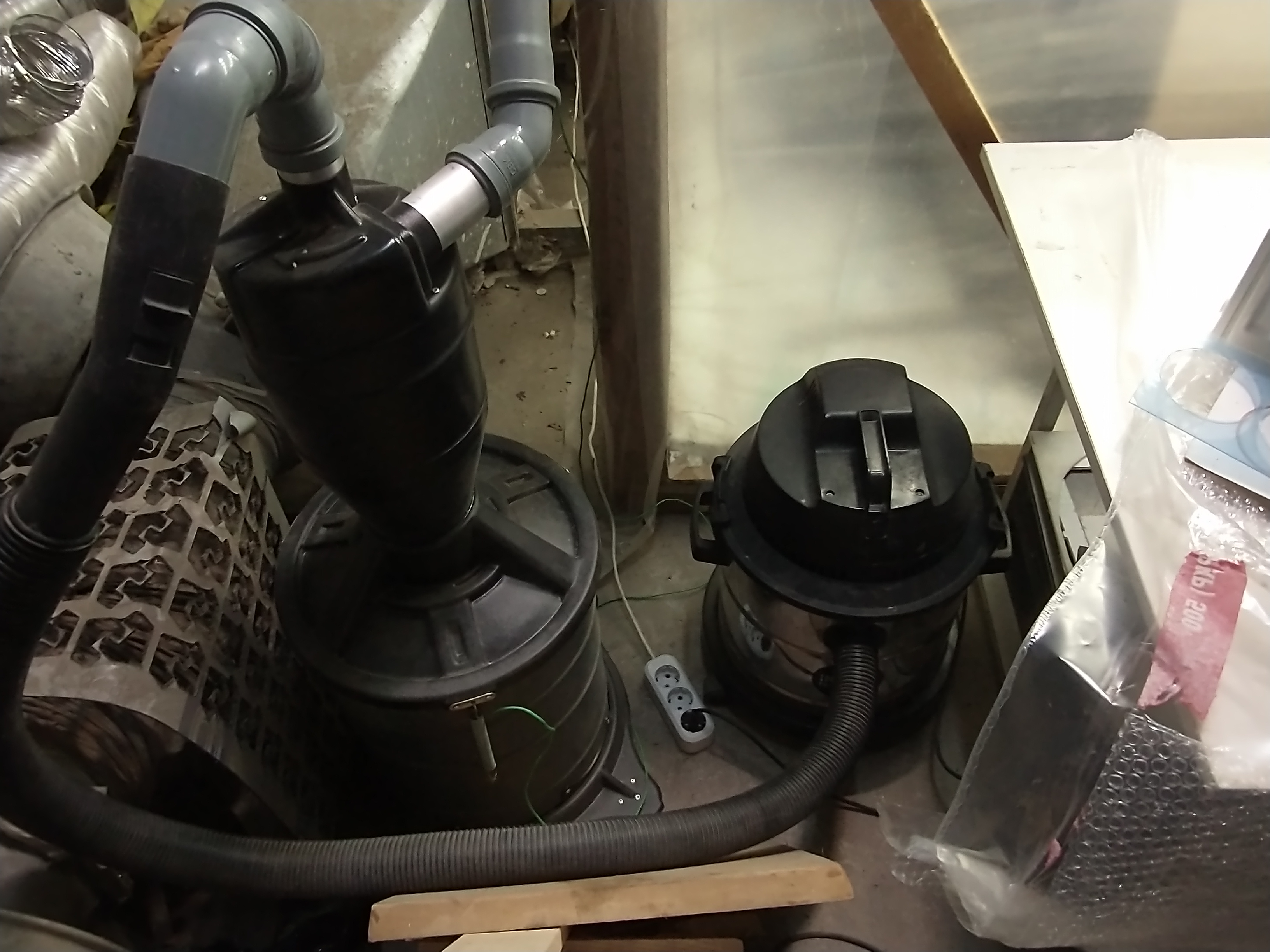 Идеально - нормальный циклон, с нормальным фильтробоксом, потому что два мешка и мотор с закручиванием воздуха это не аспирация, а средство для ловли комаров (судя по пыли вокруг этого чуда). А если добавили фильтр то надо добавлять мощность или разрежение "улитки". Ну и трубы на всё это от 100мм.