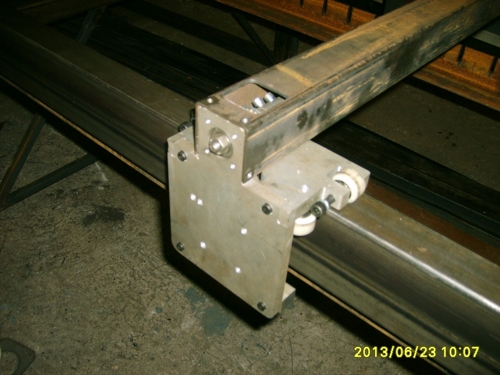 Да с одной стороны, мощная рельса, регулируется по горизонтали в доль станка и по высоте регулировочными болтами и прижимается с низу болтами к площадке. Станок консольного типа. Приводится вдоль по X 1 м мощным двигателем, что исключает перекос портала. Дигональ портала выставляется регулируемой штангой. Подшипники на каретке по X эксцентричны что позволяет убрать люфты в любое время, в случае их появления.aftaev писал(а):несущий рельс портала получается только с одной стороны?