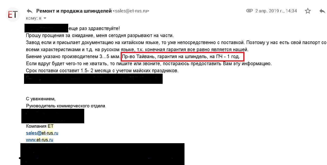 Они, видимо, перестали стирать оригинальную надпись на шпинделе. Теперь бумажную наклейку клеят со своим названием. Прикольно! Так что шпиндель никакой не тайваньский... Кстати, Вас обманули! Вам дали гораздо более ценный мех! Вам дали шпиндель 2.2кВт, а взяли как за 1.5, судя по наклейке (повреждение которой ведет к потере гарантии) Согласно сайту ЕТ, гарантия 3 года на этот шпиндель, а Вам в переписке дали всего год. Вот Вам и обманщики...
