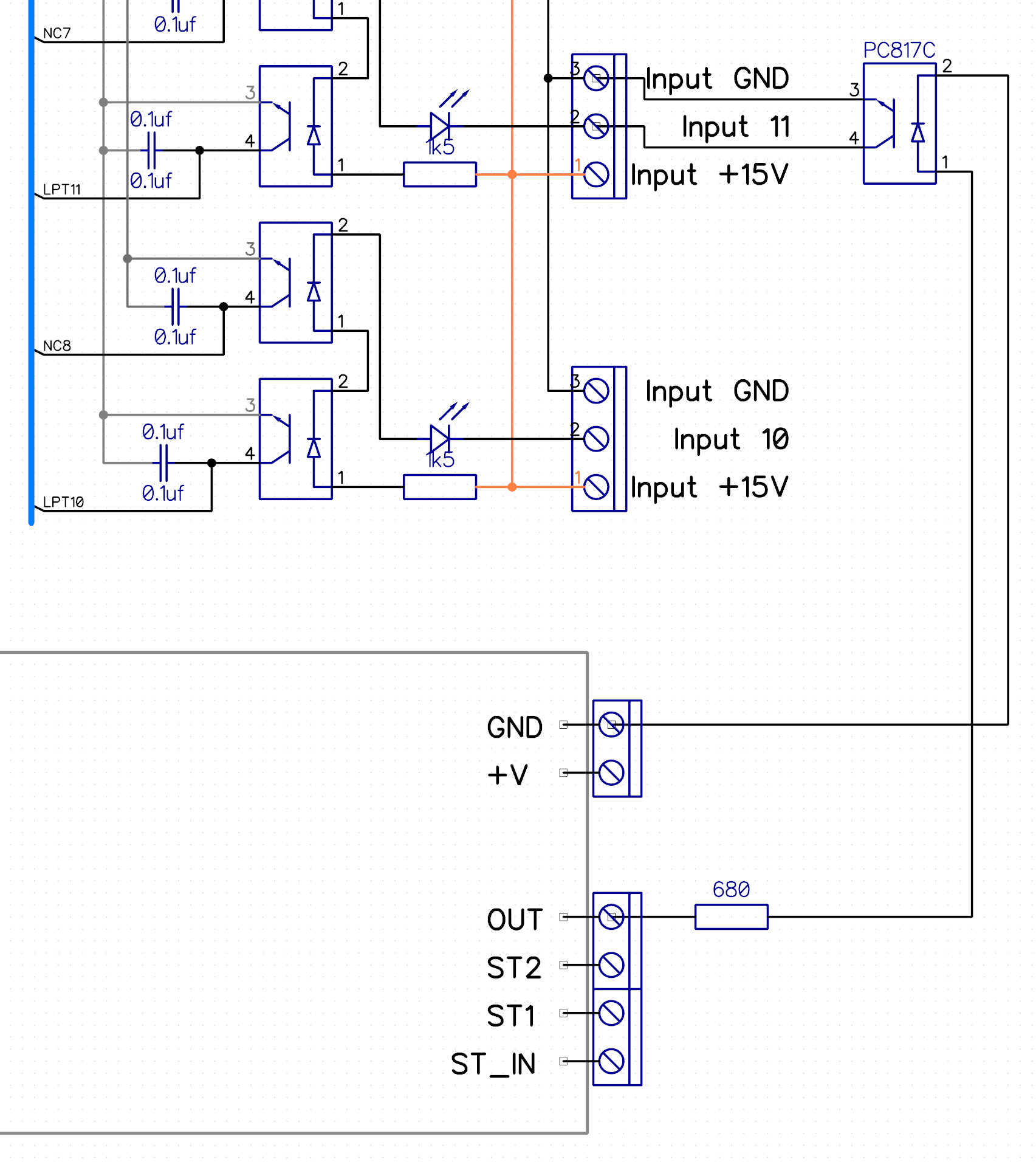Хорошо бы перед входом степмастера поставить оптопару PC817 последовательно с резистором 470 Ом — 1 кОм. Примерно так:Bender писал(а):На этой схеме соединенины питание логической части и датчиков. Это плохо....