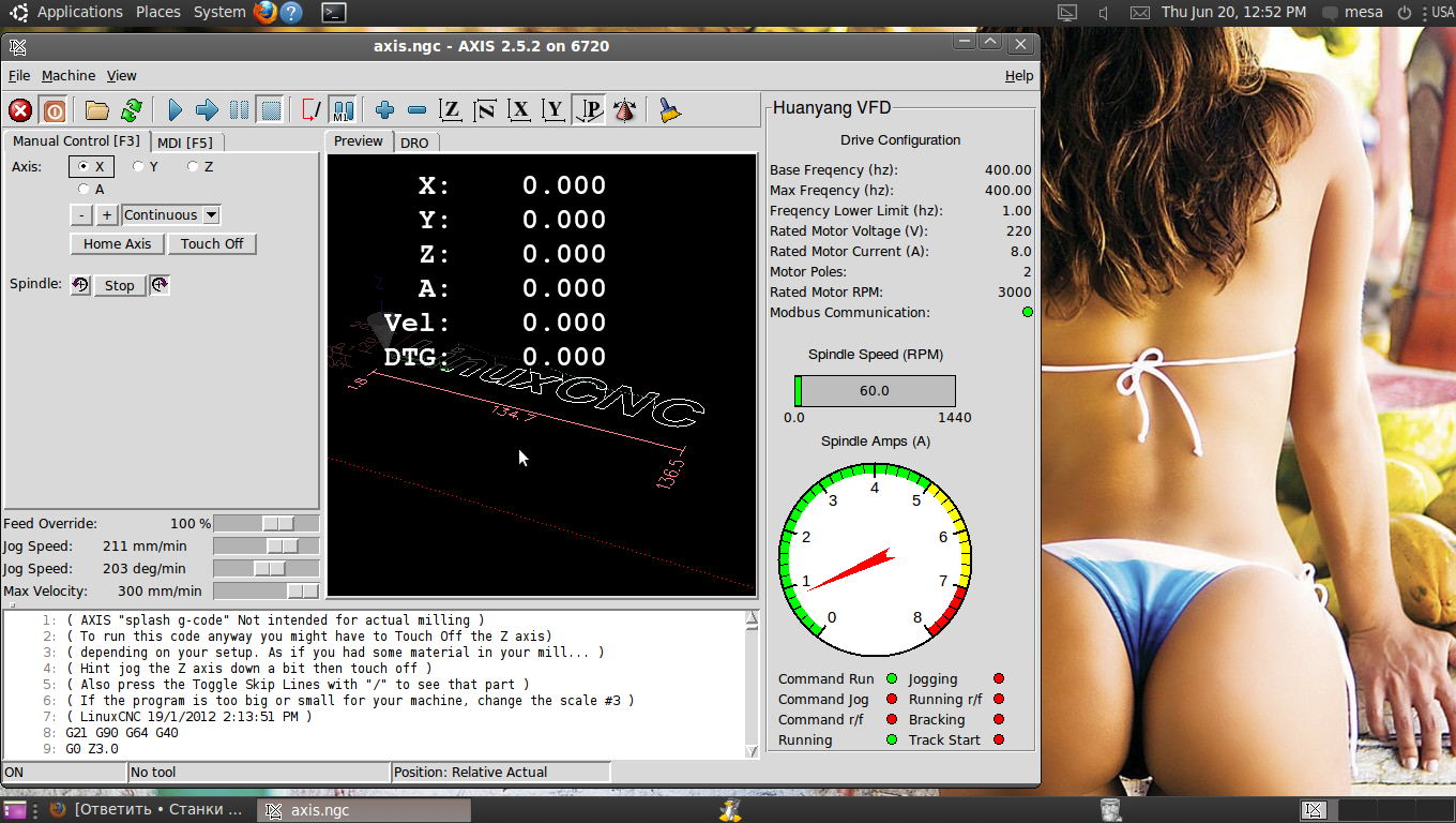 Подключил витой парой к частотнику, настроил последний для работы с RS485, закинул в /usr/local/bin файл hy_vfd из первого поста темы про modbus, присвоив ему права на исполнение. А как покрутить не врублюсь...) Нажимаю кнопку CW или CCW шпиндель начинает медленно вращаться в соответствующую сторону и все а как на обороты вывести? Давал в ручную M3 S3000 так он также как и с кнопки - еле крутится.. хэлп)