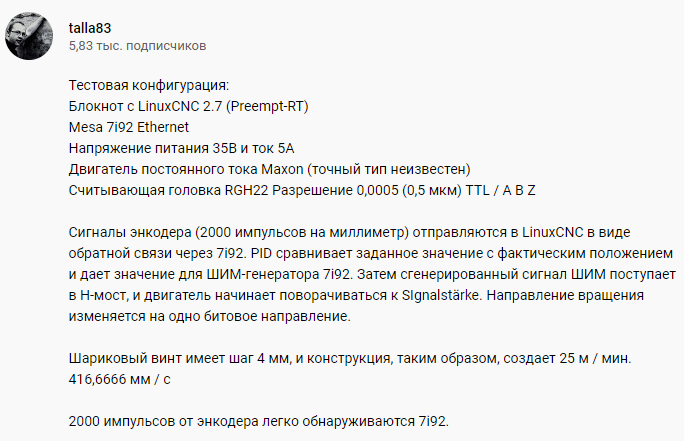 Тем не менее, человек показал в живую как это работает...Получается что временного интервала опроса в 1мс достаточно для нормальной работы даже на больших скоростях и с хорошей дискретностью? Получается что если PID настроены правильно, то комп дает корректные данные для отработки плате mesa, а та в свою очередь их корректно отрабатывает. Если при следующем опросе система не вывалилась за допустимую ошибку рассогласования, то едем дальше. Если рассогласование больше допустимого, то E-Stop?Serg писал(а): ↑17 фев 2021, 12:01Там просто аналог. Про PWM говорится потому, что нет 7i77 с готовыми аналоговыми выходами, т.е. схема такая: ПИД -> PWM -> PWMtoAnalog -> Сервоусилитель -> Мотор -> Энкодер -> ПИД.antoxa-kylibin писал(а): ↑ Вместо step/dir используется pwm/dir и моторы коллекторные, а не шаговики...