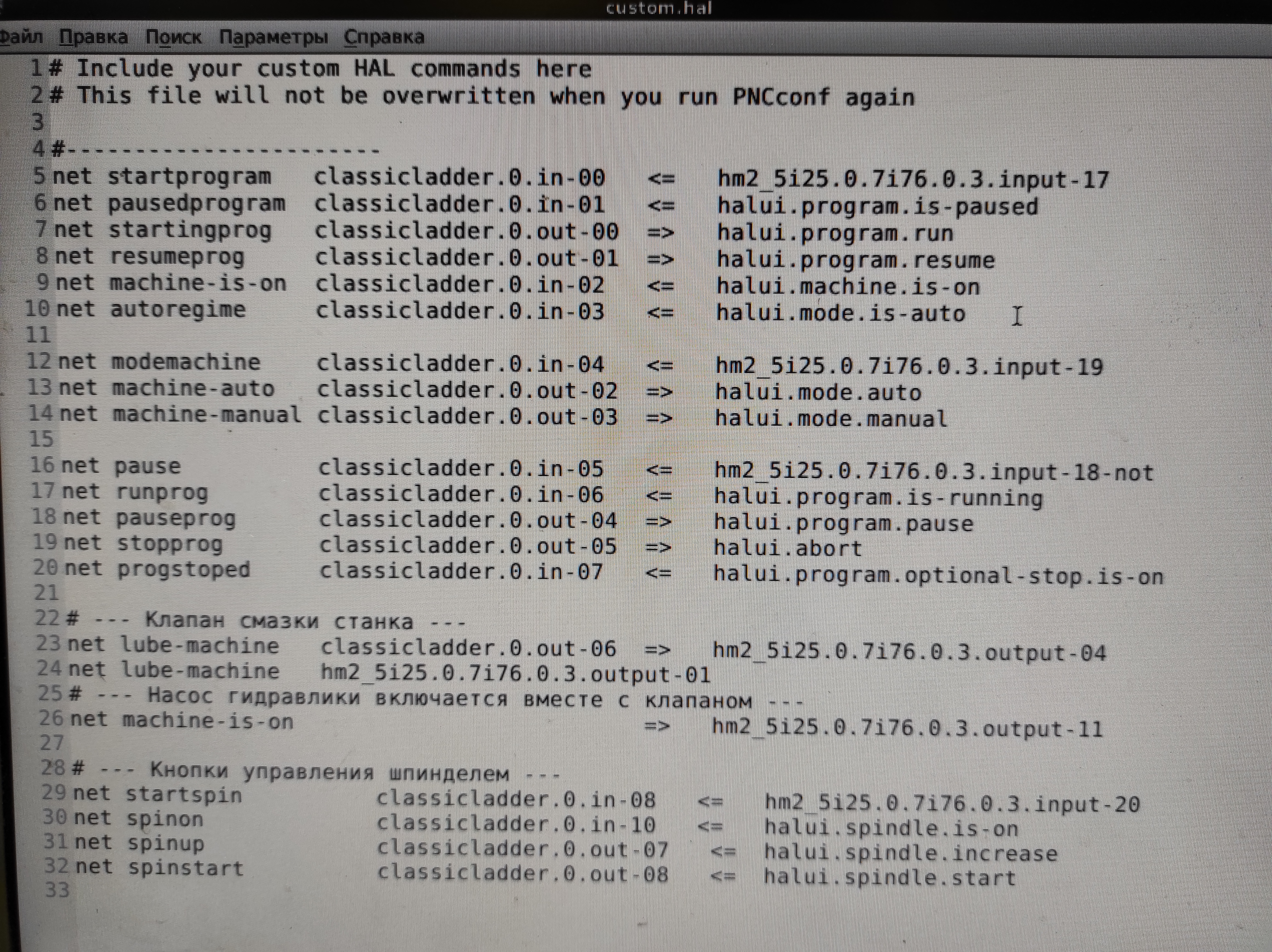 Скажите плз. Ели у меня подключено к LPT, через простую карту опторазвязки, что-то надо будет подкорректировать?skytronix писал(а): ↑27 май 2021, 11:36 У меня на станке есть две кнопки, подключенные к MESA входам. Одна отвечает за старт программы и продолжение если программа уже на паузе, вторая отвечает за саму паузу. Сама логика сделана через PLC редактор. Ну я думаю вникните в суть и приспособите под себя))))