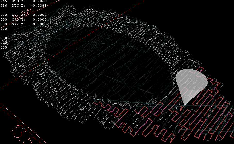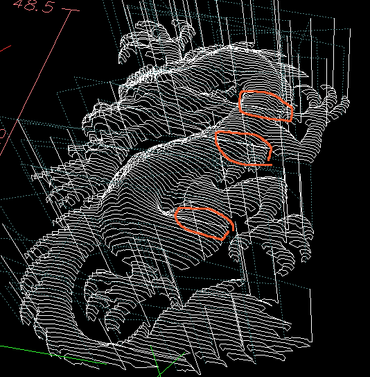 пройдя по красным линиям(я задаю небольшой "съем за проход" - и используя тонкую фрезу выбираю материал) - можно тонкой(этой же) фрезой проходится по рельефу 1-ин! проход - т.е. в один слой - т.е. не задавать "съем за проход" - и при этом не будет нагрузки на фрезу - т.к. - не останется мест с несрезанным рельефом более "
