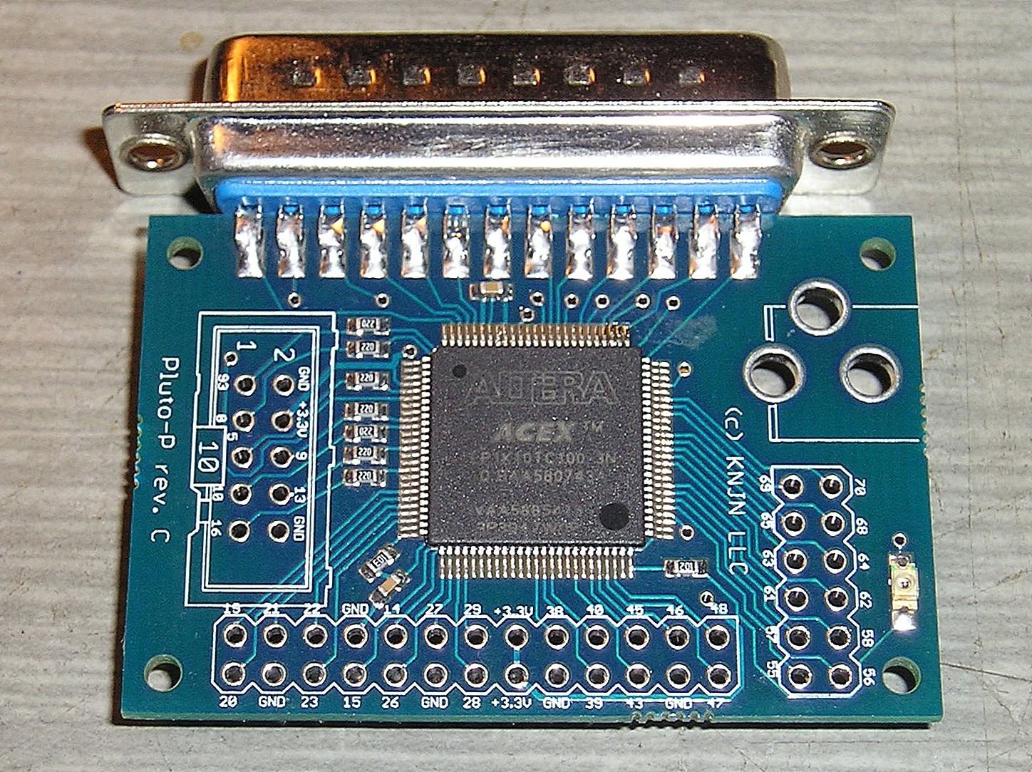 В пакете обнаружилась сама плата, а также гнездо питания отдельно. Разъем для подключения к LPT был припаян, остальные разъемы (гребенки) отсутствовали. На верхней стороне платы присутствует сам чип ПЛИС (FPGA) типа EP1K10TC100-3N, светодиод, несколько резисторов и конденсаторов. На обратной стороне - стабилизатор на 3,3В, кварцевый генератор на 40МГц, три трехногих деталюшки, из которых две, по всей видимости, транзисторы, и одна - диодная сборка.