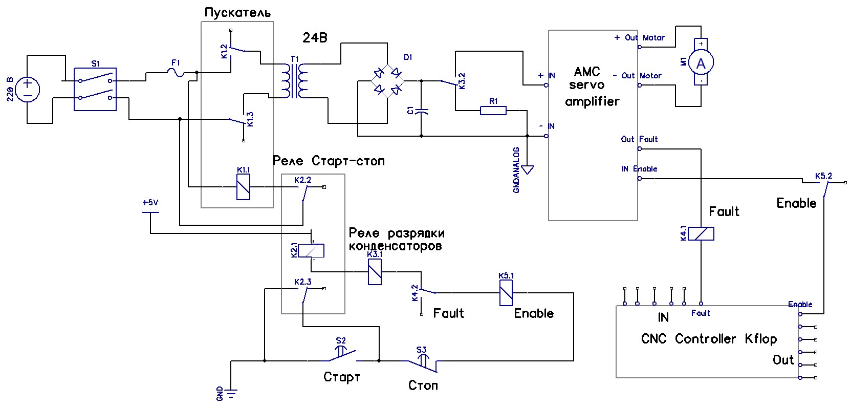 При нажатии кнопки Старт, срабатывает реле 2, которая в свою очередь коммутирует пускатель 1. Одновременно срабатывает реле 3 разрядки конденсаторов на пропускание тока и реле 5 разрешения подачи сигнала Enable. Если возникает ошибка на усилителе, то реле 4 выключает всю силовую часть.