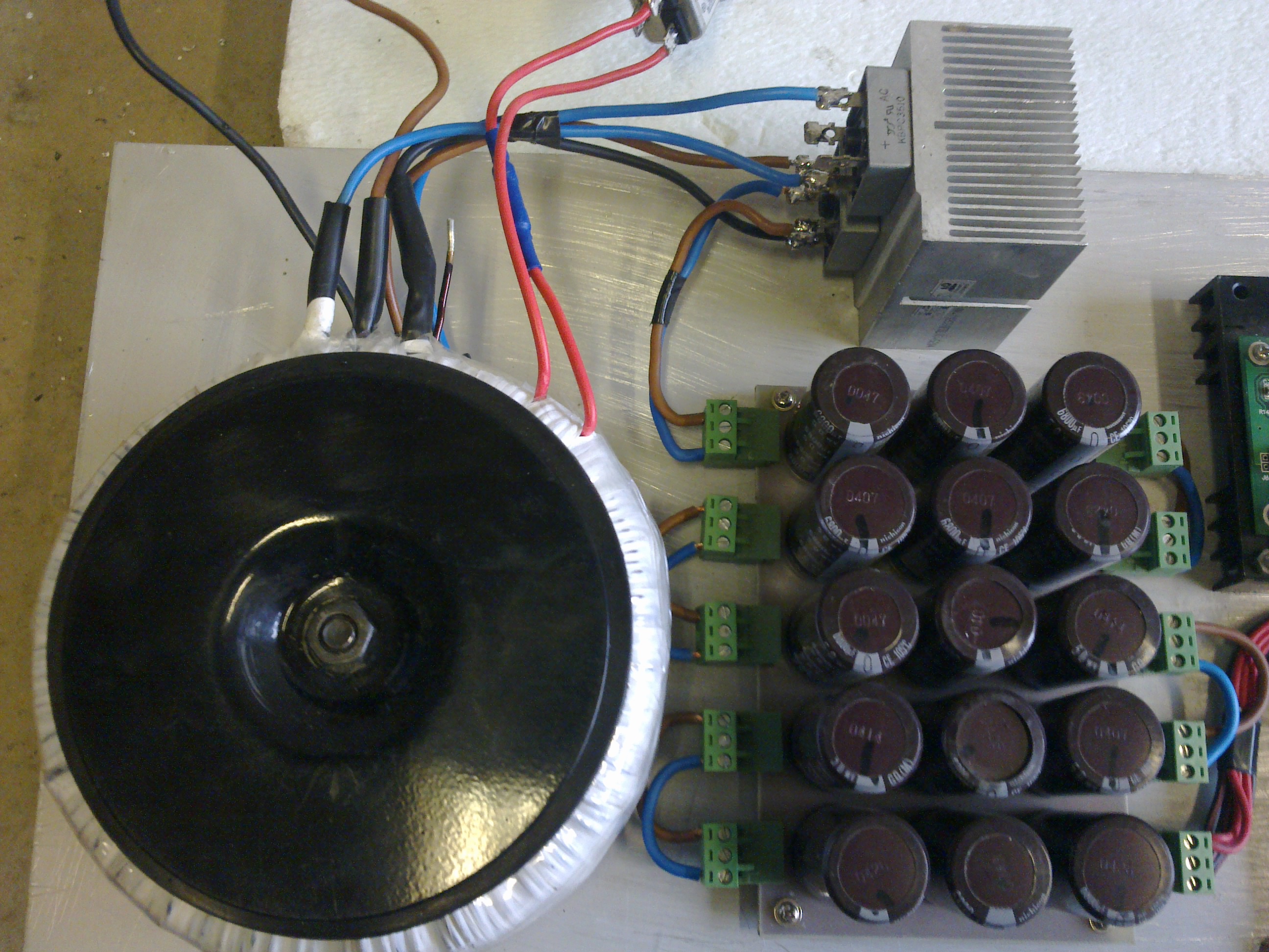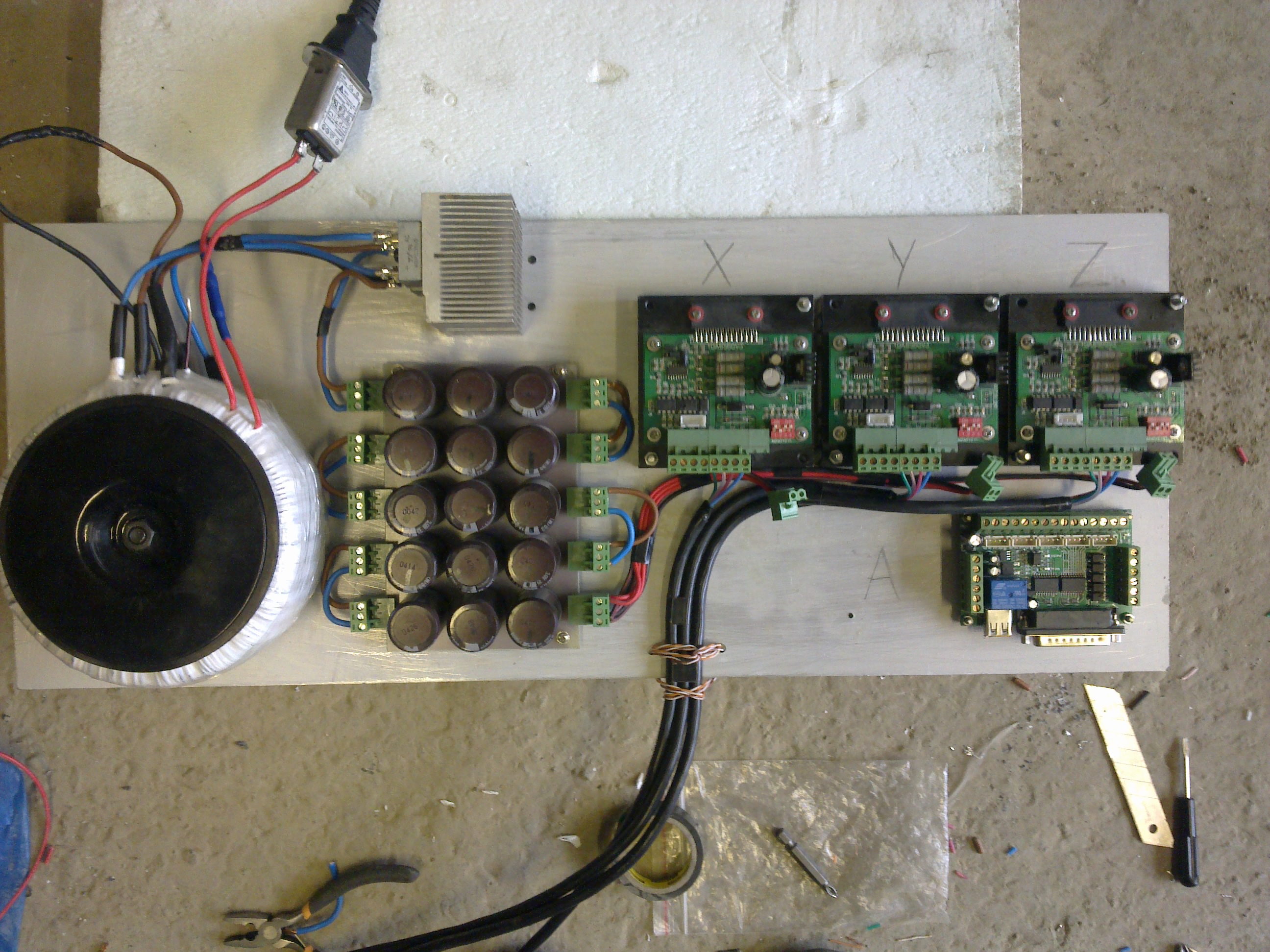 Как успехи, получилось с питанием, хотел показать что у меня. все теже драйвера на tb6560ahq, питание тороид от софитов (500вт) переделал с 12в на 28 в, с отдельным отводом на 12в, на всякий случай, диодный мост и конденсаторы, на выходе 34в, на нагрузке 33, 5 ниже не отпускался.