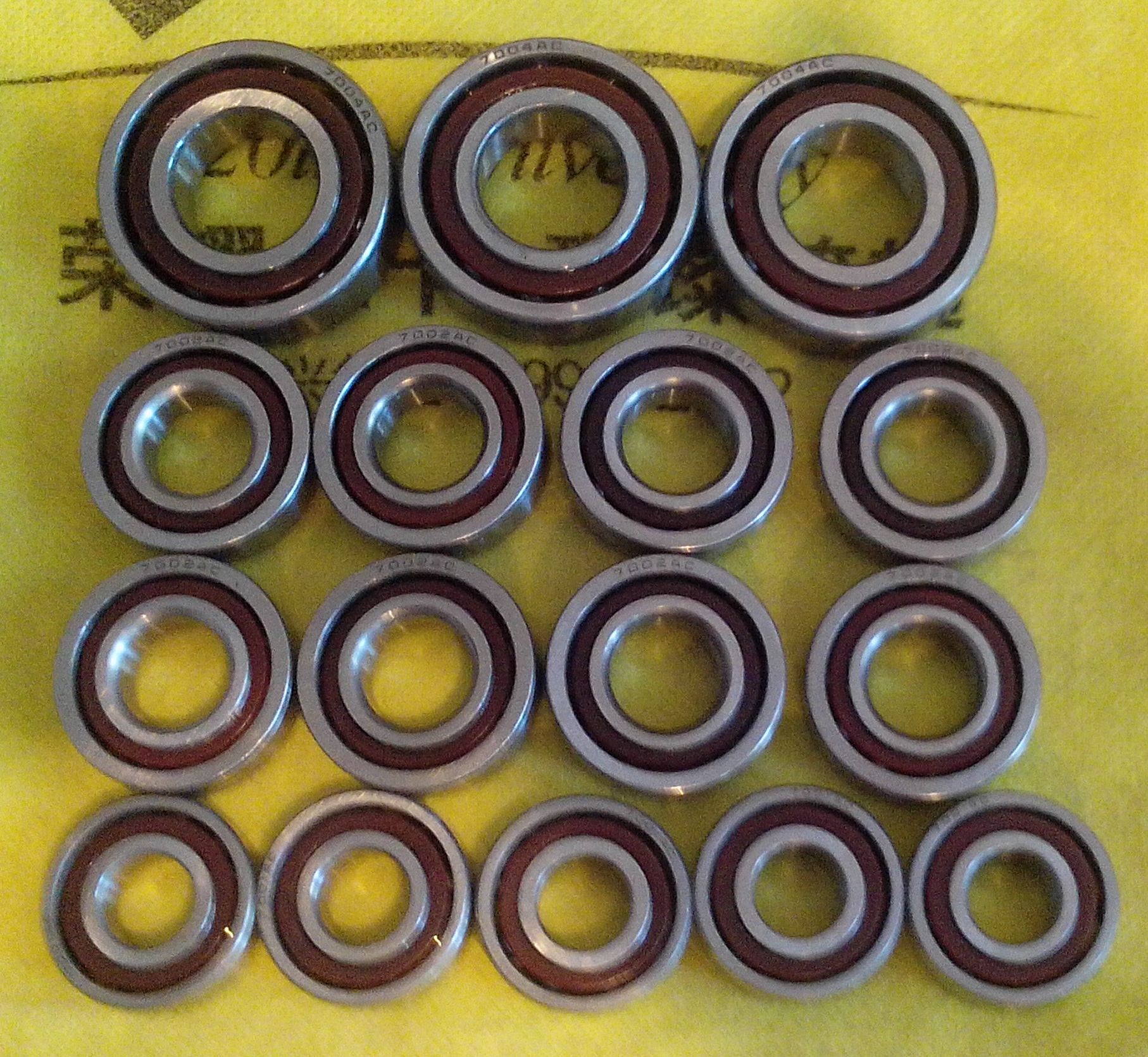 Подшипники 7001АС (25 град.), 7002АС (25 град.), 7004АС (25 град.), класс точности не знаю, продавец уверяет, что это фабричный Китаец. Граверовка выбита на каждом подштпнике, очень точно, не криво,, запечатаны были аккуратно, люфт такой же как у оригинала NSK (для сравнения покупал у представителей на заказ за 48$). Писал выше, сколько уже отработали, сам хотел поменять, разобрал, а там износа "0" хотя столько уже камня (гранита) нарезал.