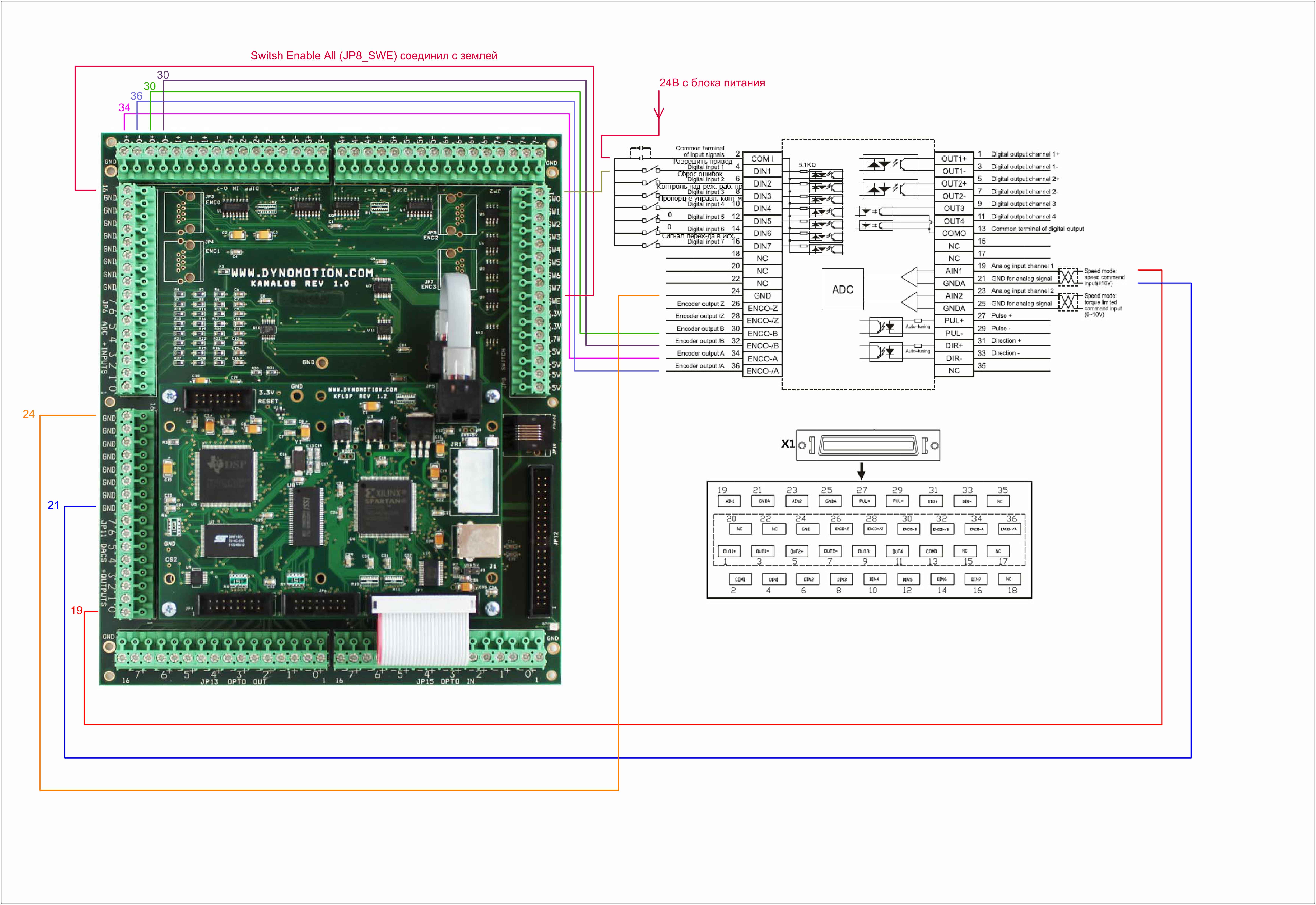 Далее, подключил усилок к контроллеру, как на картинке снизу. Скорее всего сигналы +/-10В и энкодеры я подключил правильно, а вот как подать сигнал Энейбл???... пока сделал так: На разъеме JP8 выход SWE соединил с землей, выход SW0 соединил с DIN1 усилка, на COM1 усилка подал 24В с внешнего блока питания.