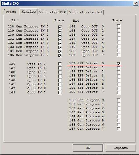 В окне Digital I/O ставлю галочку напротив 152 бита (JP8_Switch0) и вал двигателя встает в удержание: