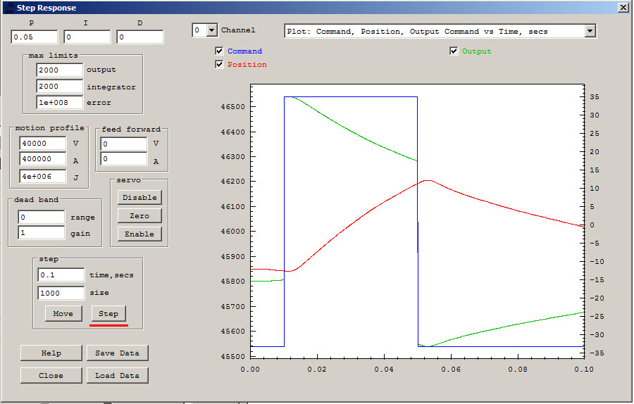 В окне Step Response, нажимаю Move и Step и вал двигателя реагирует незначительным шевелением. Ниже скины и видео.