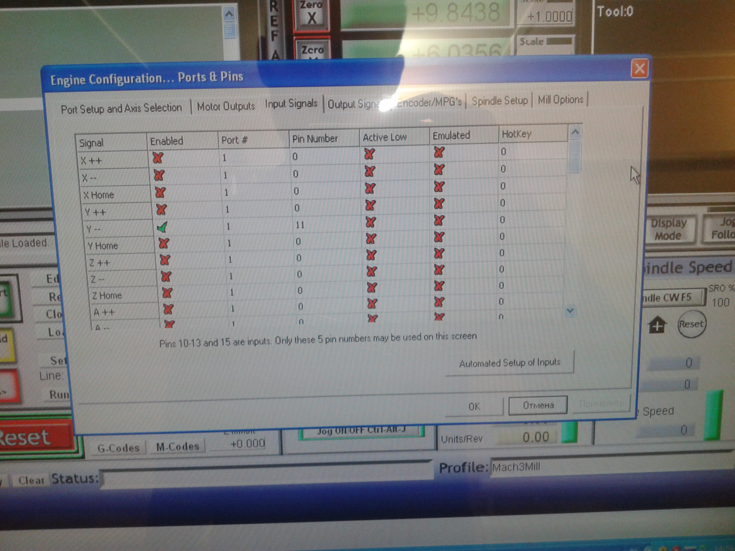 Инверсию кнопок пробовал - получается два варианта: либо на нажатие кнопки не реагирует вообще либо reset мигает и не сбрасывается. то еть как бы блокирующий сигнал от концевика или e-stop идет. завтра посмотрю что там в закладке диагностики