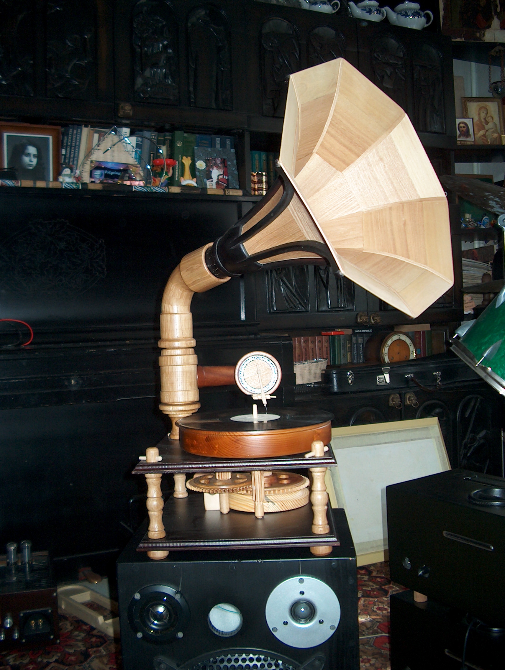 Граммофон на 78 оборотов. Полностью из дерева, только пружина металлическая.
