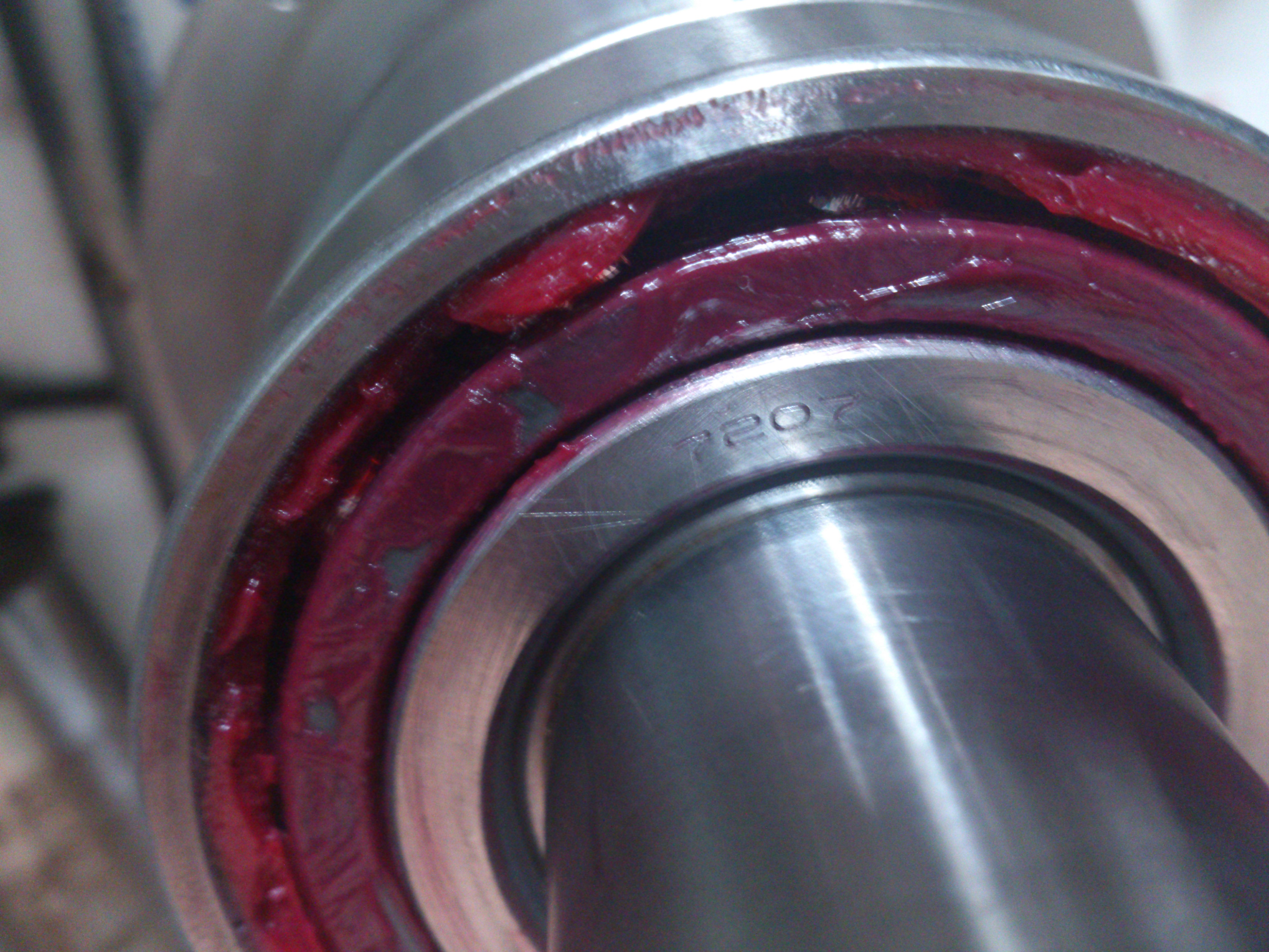 Разобрал еще немного шпиндель. Дальше пока никак - нужен либо длинный съемник, либо прокладки под пережний блок и "тюк-тюк" кияночкой по хвосту шпинделя. Маркировка подшипников пока так и не открылась, кроме номера подшипника - 7207.