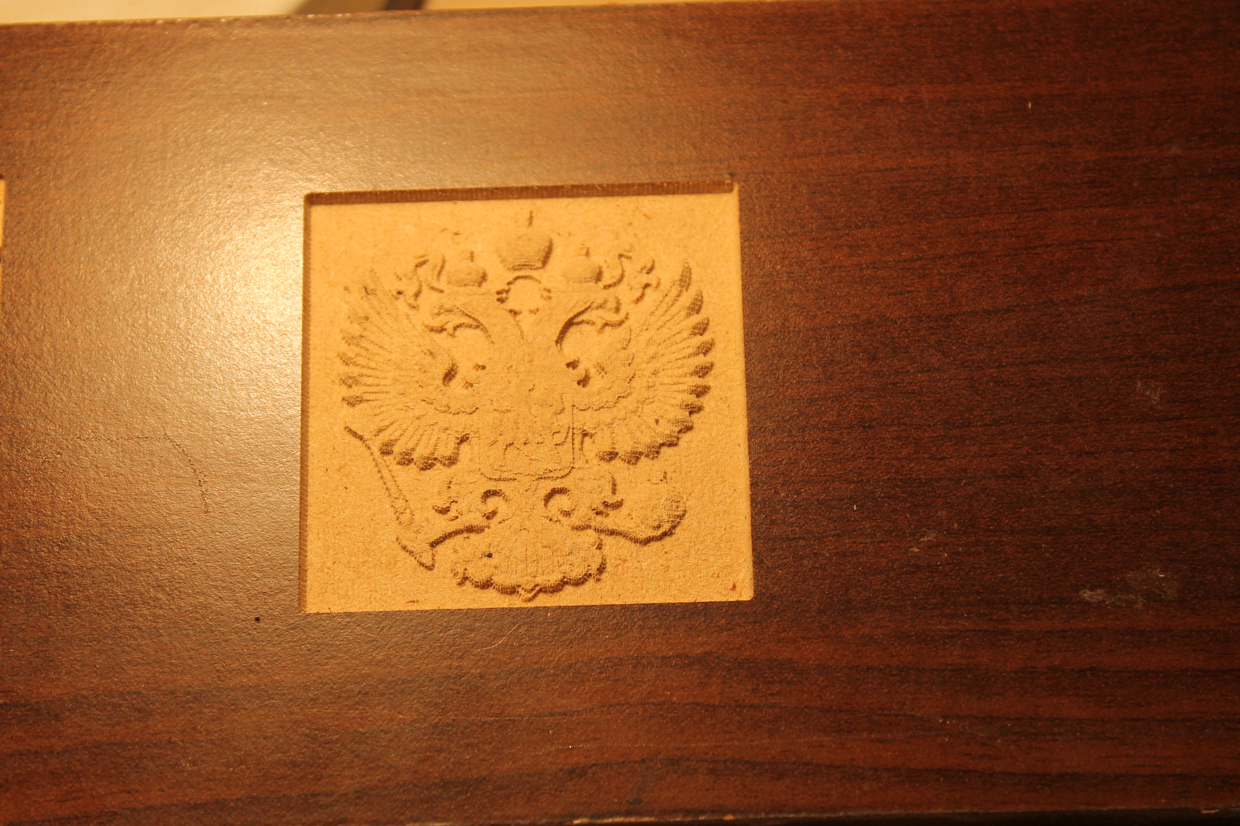 И первым делом решил попробовать его на гербе РФ, но как оказалось я недоглядел и пустил рез по тому месту, где делал настроечный рез. И как оказалось я делал этот рез поломанной фрезой.